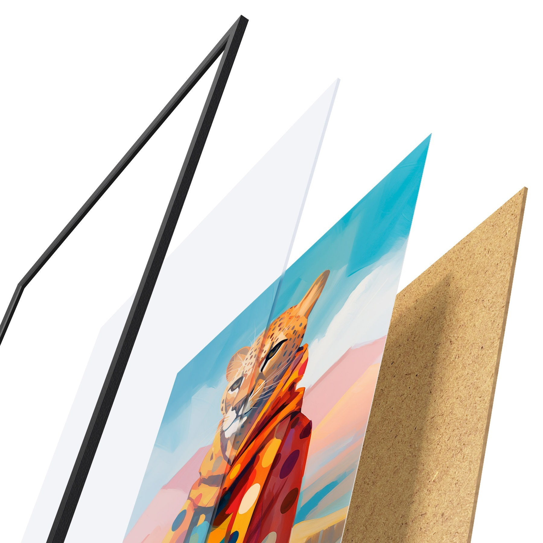 Plakatą sudaro rėmas, pleksiklas, atspausdintas vaizdas ir medžio drožlių plokštės pagrindas. Plakatą galima iš karto pakabinti ant sienos dėl kitoje pusėje esančių laikiklių.