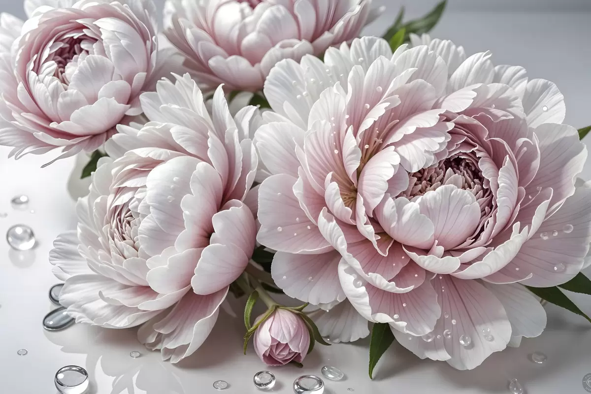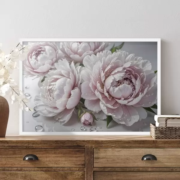 Plakatas Šviesiai rausvi ir balti bijūnai su vandens lašeliais ant žiedlapių, fonas - baltas paviršius f43158