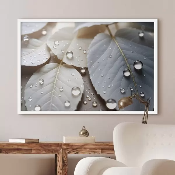 Plakatas Vandens lašeliais padengti balti lapai stambiu planu, minimalistinė kompozicija, neutralus fonas Ne f43159