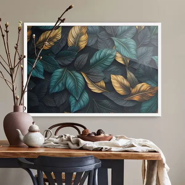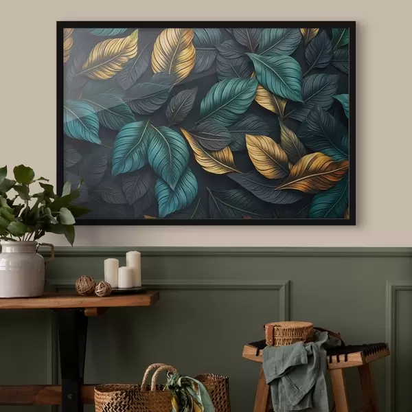 Plakatas Tamsiai žali, geltoni ir juodi lapai su tamsiomis gyslomis, tamsiame fone, elegantiška atogrąžų atmosfera f43164