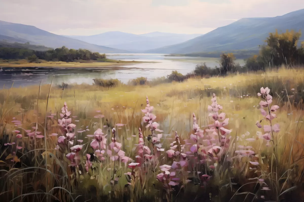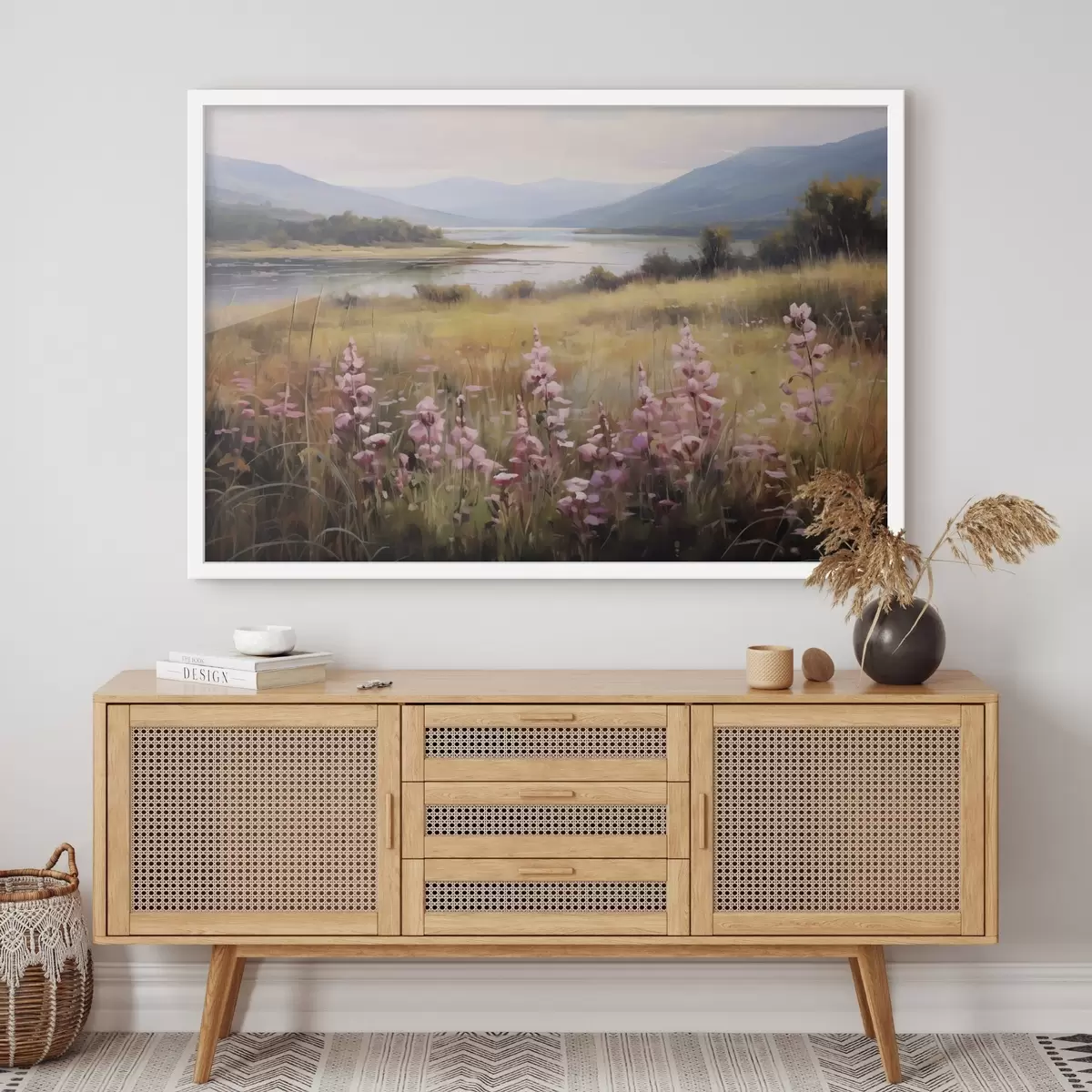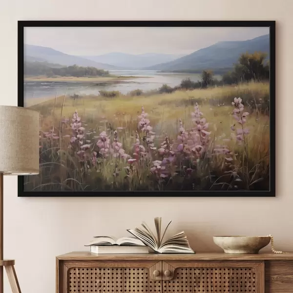 Plakatas Peizažas su rausvų gėlių lauku, ežeru ir kalnais fone, po debesuotu dangumi Ne f43165