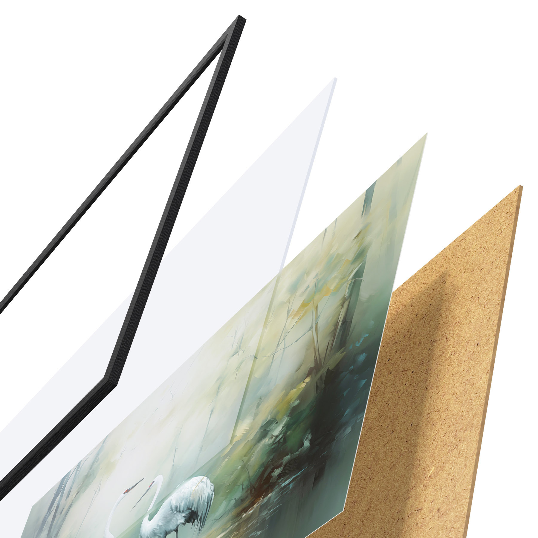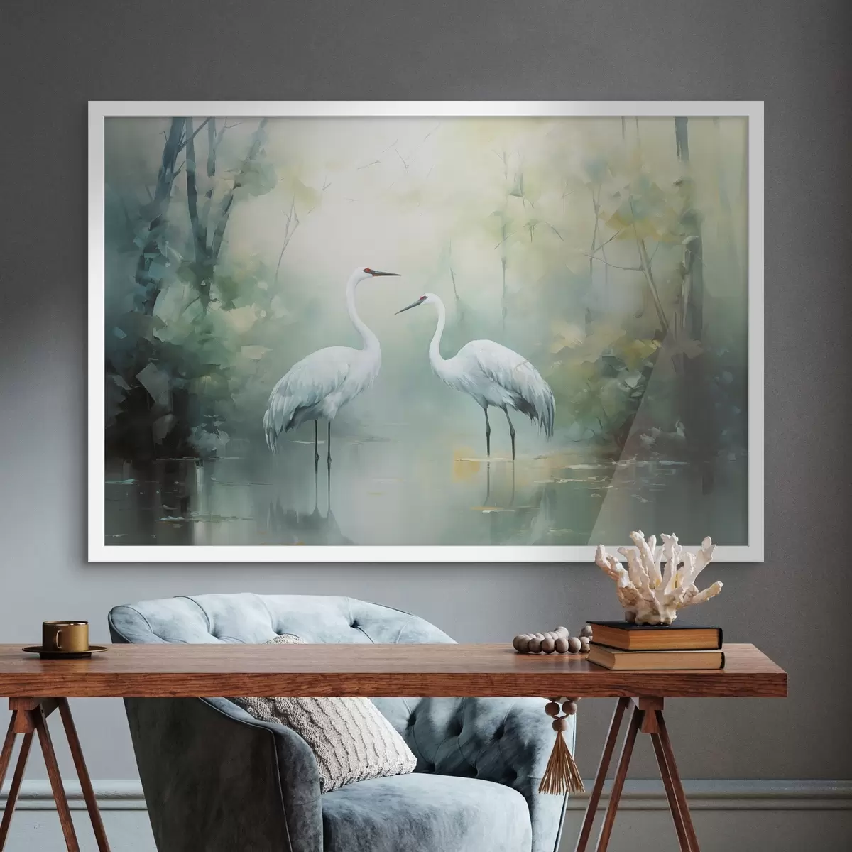 Plakatas Tvenkinyje stovinčios dvi baltos gervės, apsuptos sodraus žalio miško su švelniu, išsklaidytu apšvietimu Ne f43166