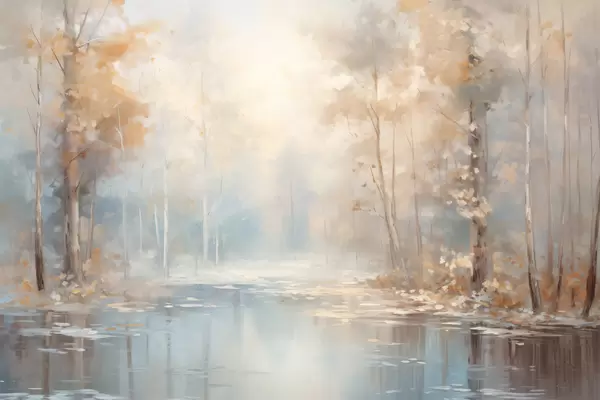 Plakatas Peizažas tapyba aliejiniais dažais imitacija ramios upės atspindi minkštą šviesą, apsuptas rudens medžių Ne f43167
