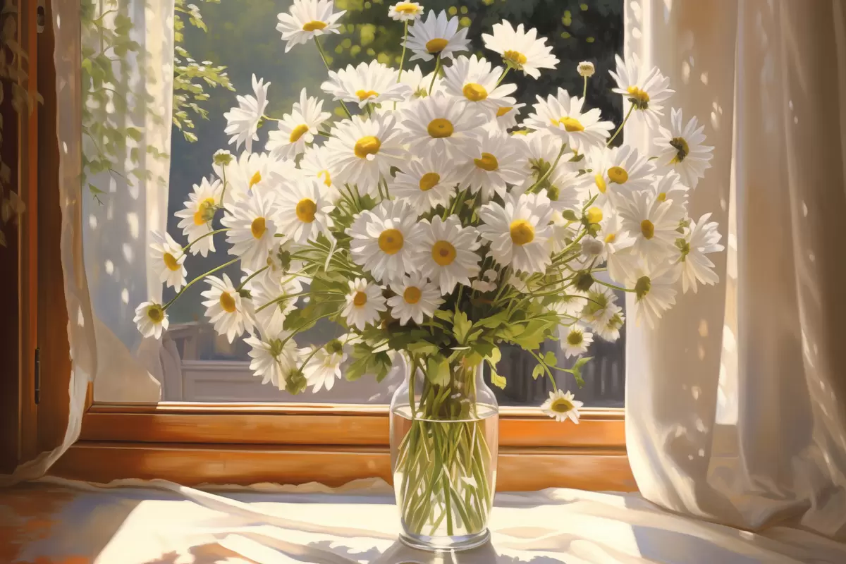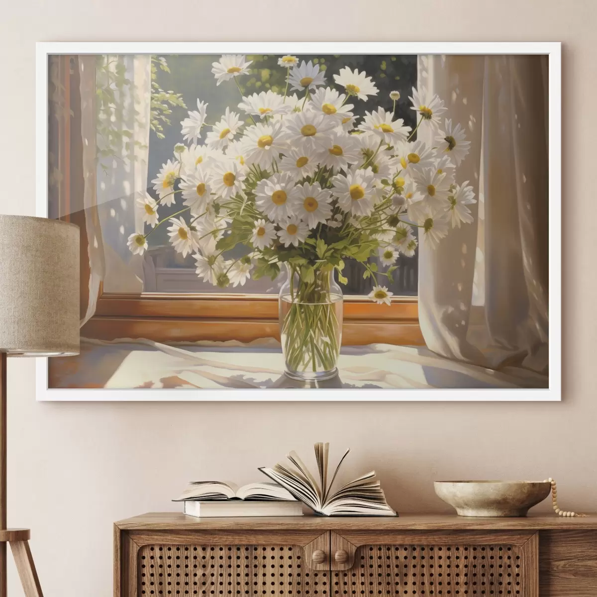 Plakatas Tapyba aliejiniais dažais imitacija vazos su baltais margučiais ant palangės, saulėtą dieną, šiltų spalvų paletė Ne f43171