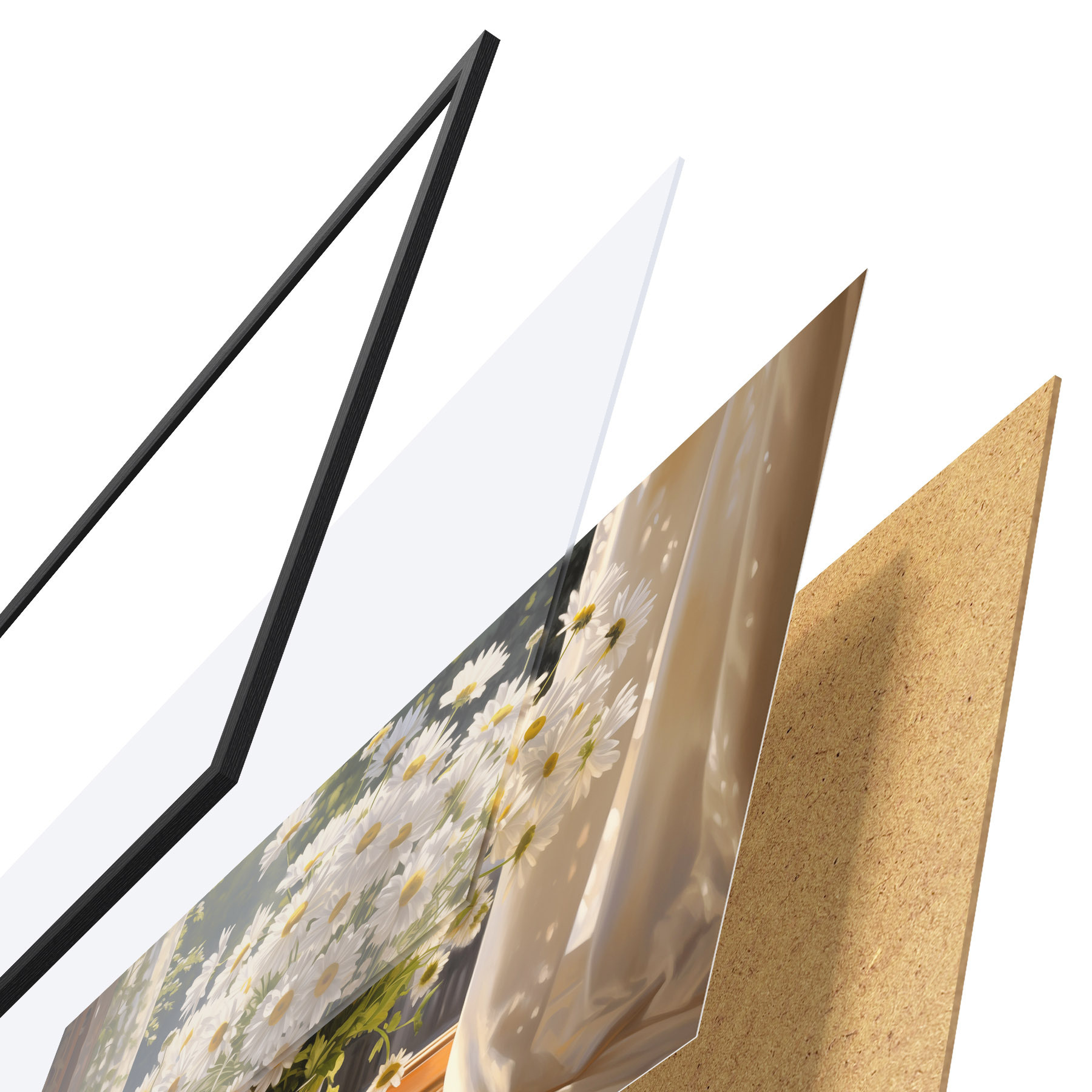 Plakatas Tapyba aliejiniais dažais imitacija vazos su baltais margučiais ant palangės, saulėtą dieną, šiltų spalvų paletė f43171