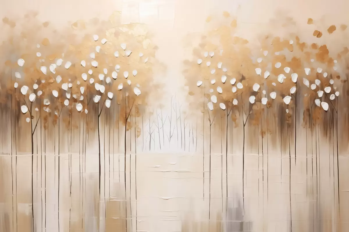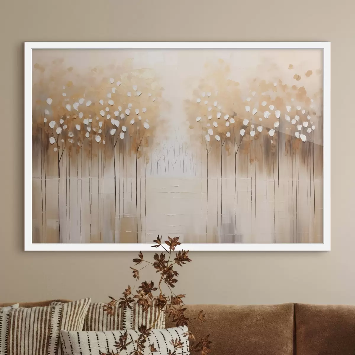 Plakatas Tapyba aliejiniais dažais imituojant rudus medžius su baltais lapais miške su upe viduryje, baltame fone Ne f43172