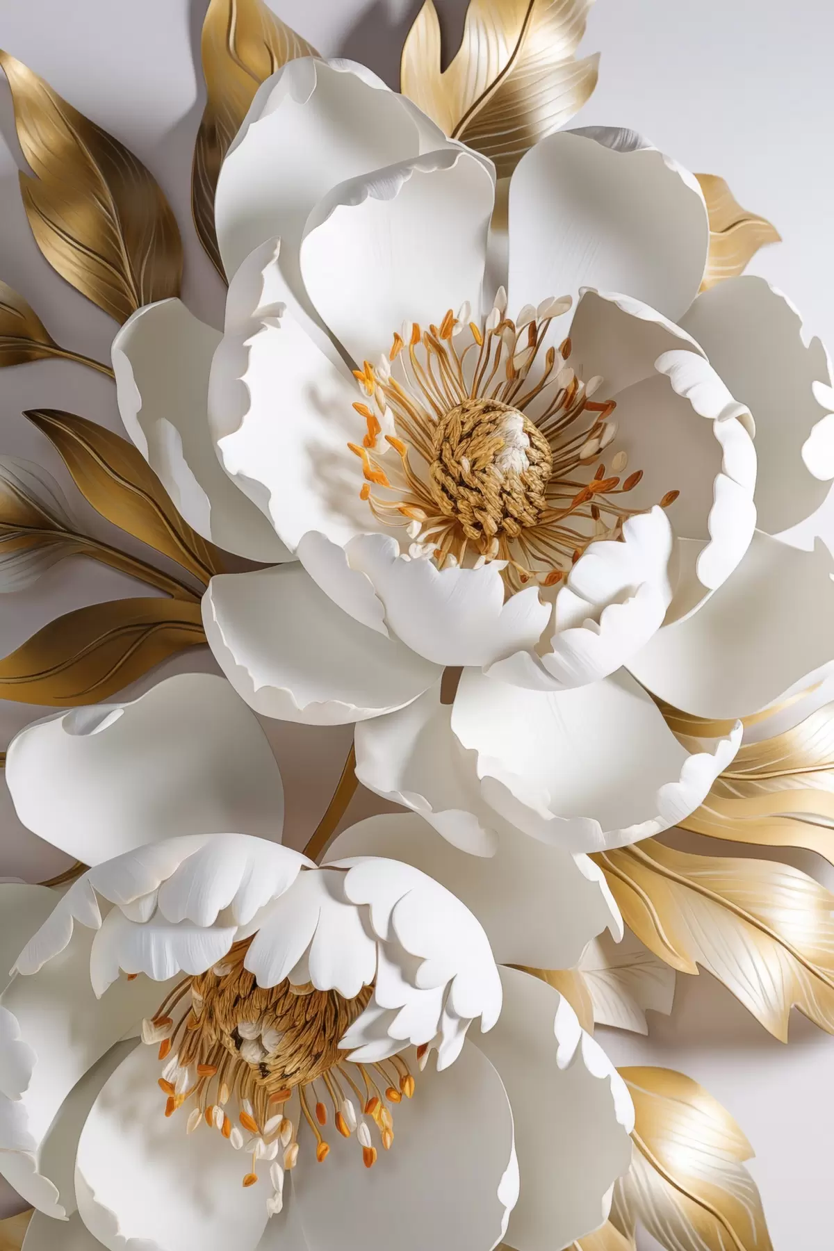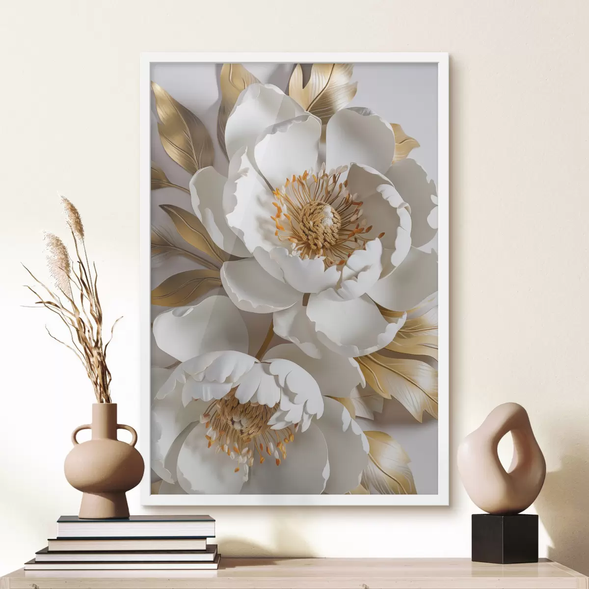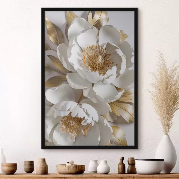 Plakatas Baltos subtilios detalios dekoratyvinės bijūnų gėlės su geltonais lapais, fonas yra šviesiai pilkos spalvos f43176