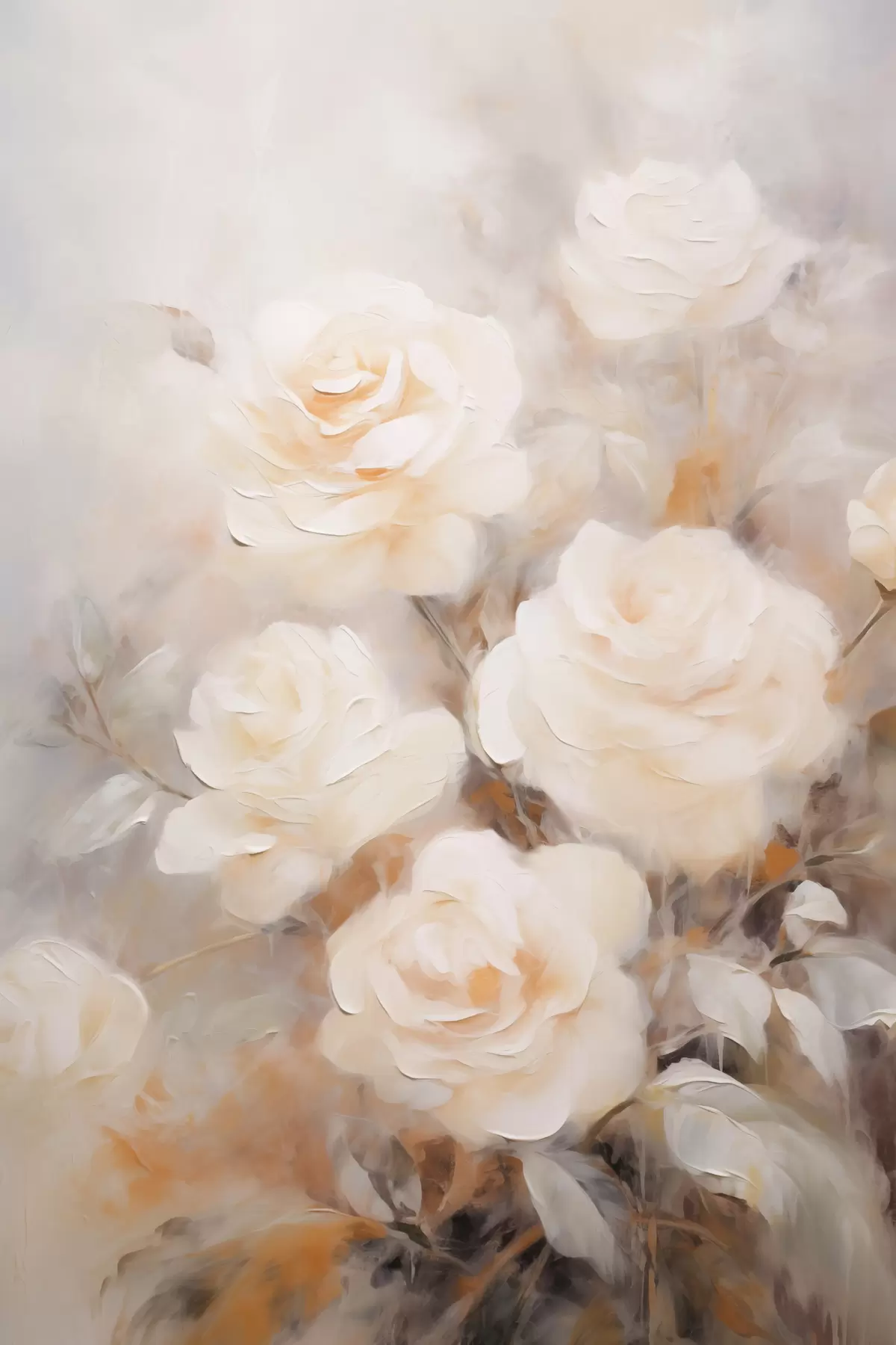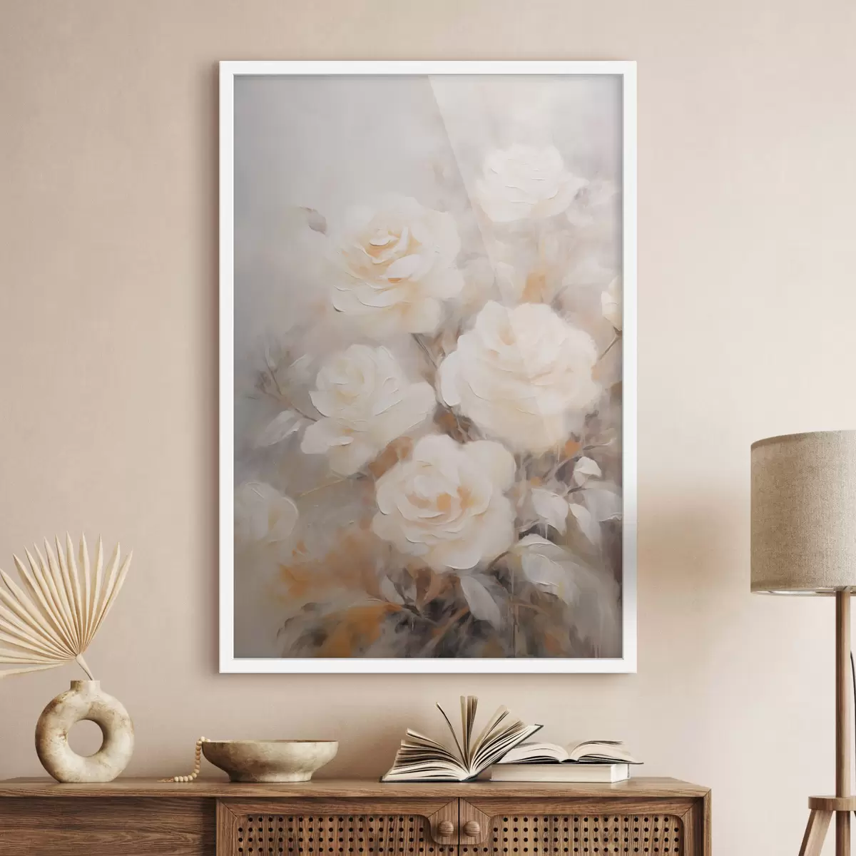 Plakatas Baltos rožės su švelniais žiedlapiais, prislopintų spalvų ir neryškių formų fone, sukuriančios svajingą efektą f43177