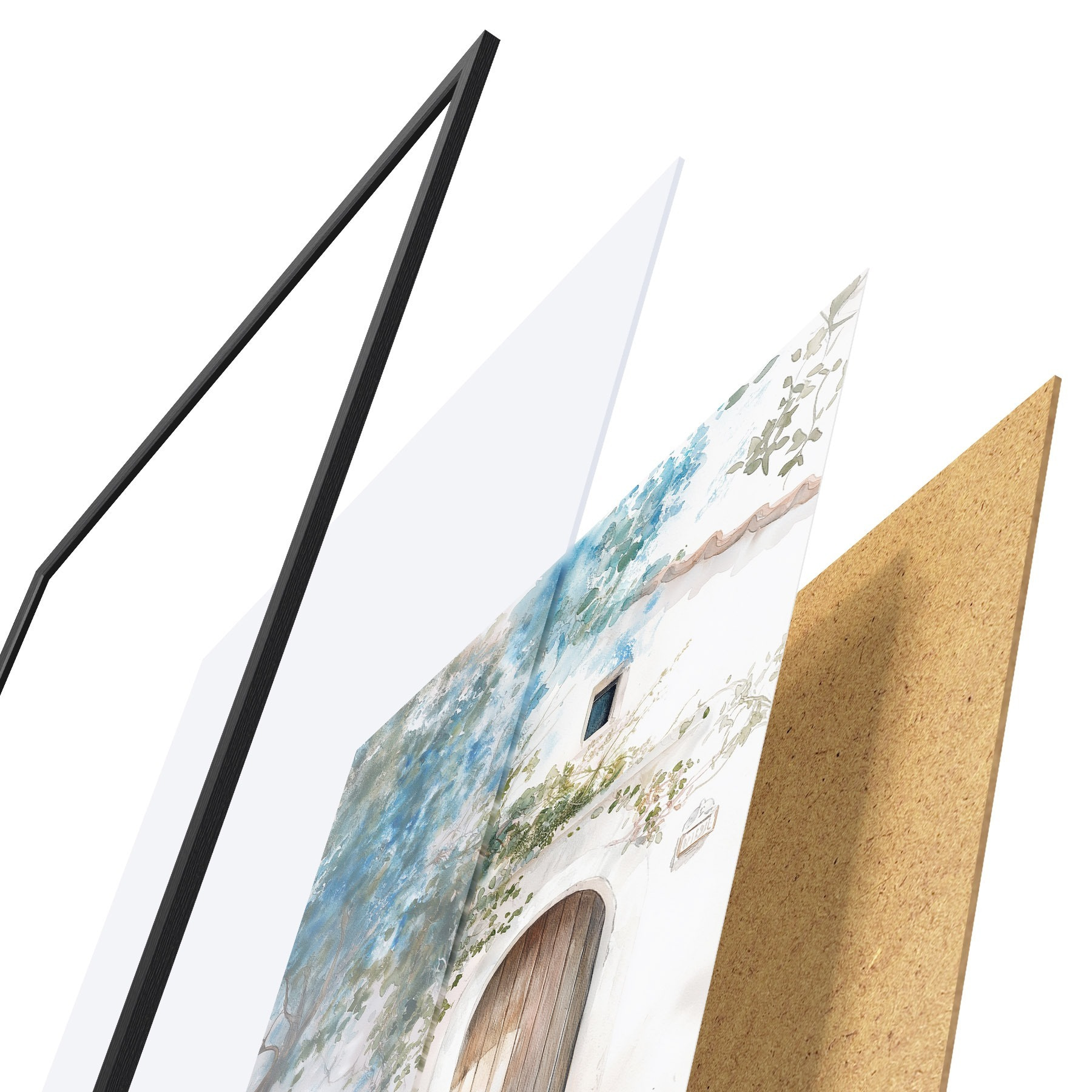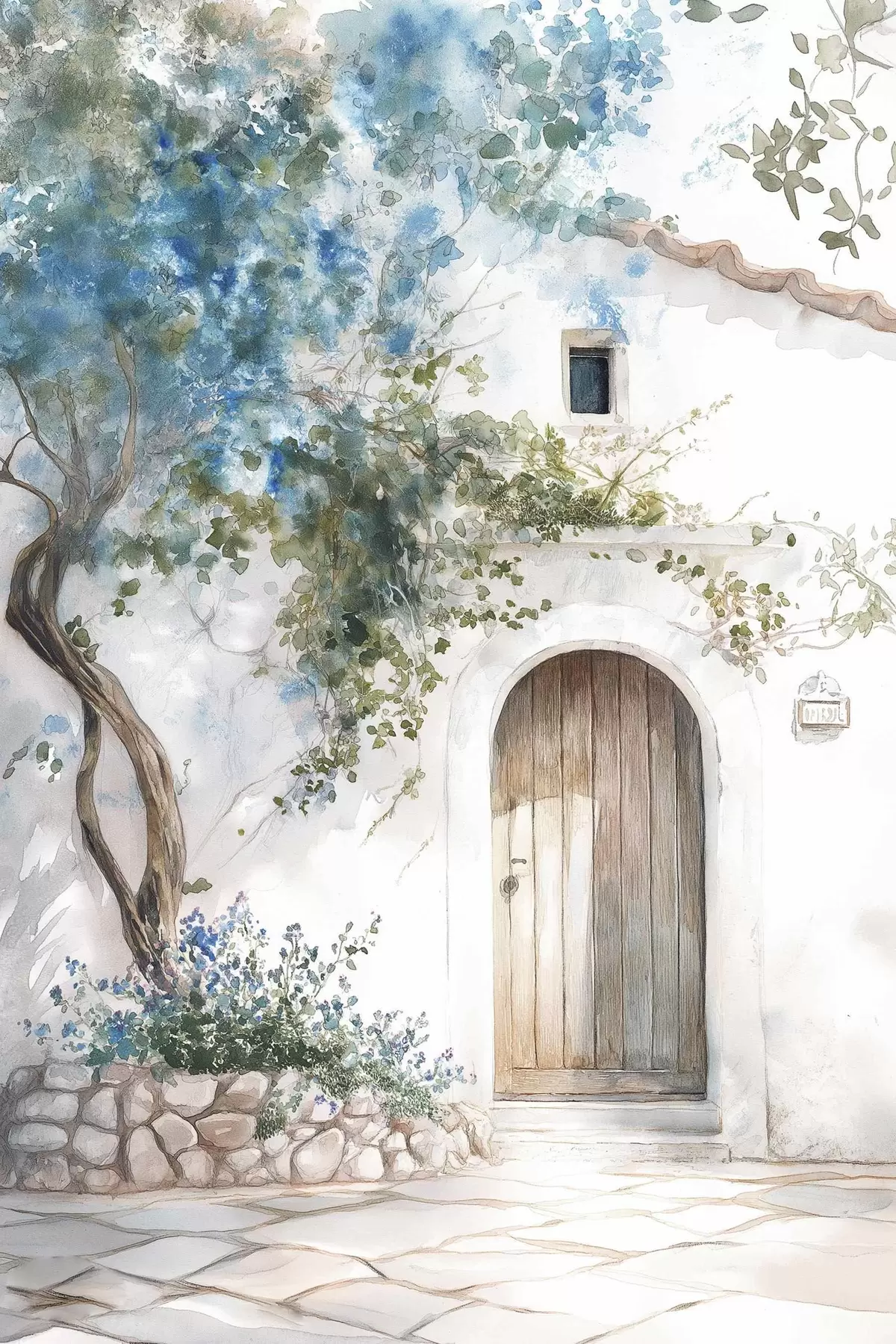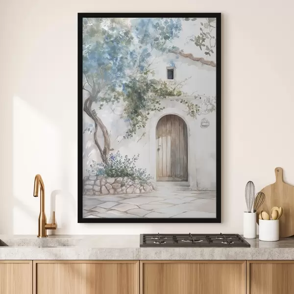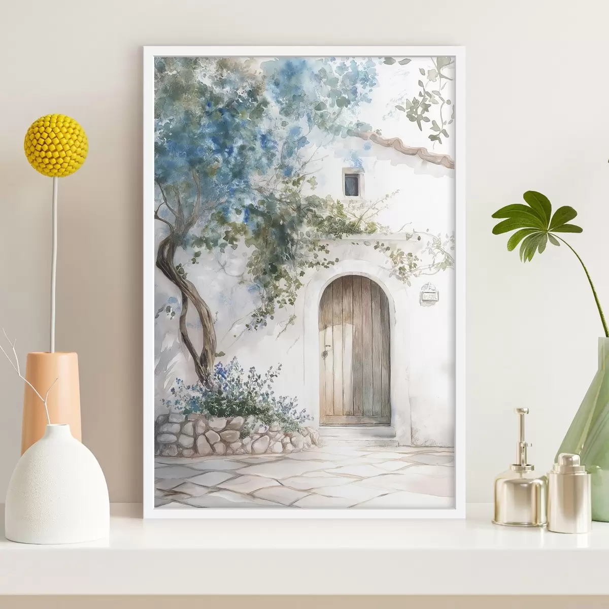 Plakatas Gražus baltas namas su žydinčiu medžiu, Viduržemio jūros regionas, akvarelės stilius Ne f43179