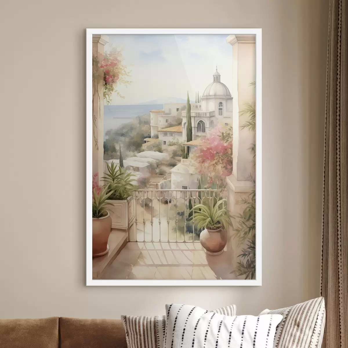 Plakatas Ispanijos vasaros kraštovaizdis, Viduržemio jūros regiono architektūra, akvarelės stilius Ne f43181