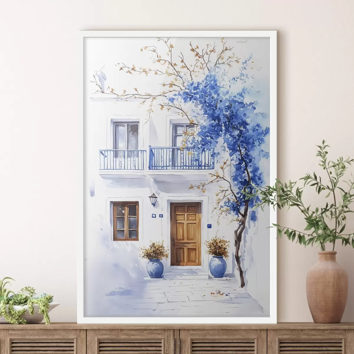 Plakatas Žydintis medis su mėlynomis gėlėmis, baltas namas, Graikija, akvarelės stilius Ne f43183