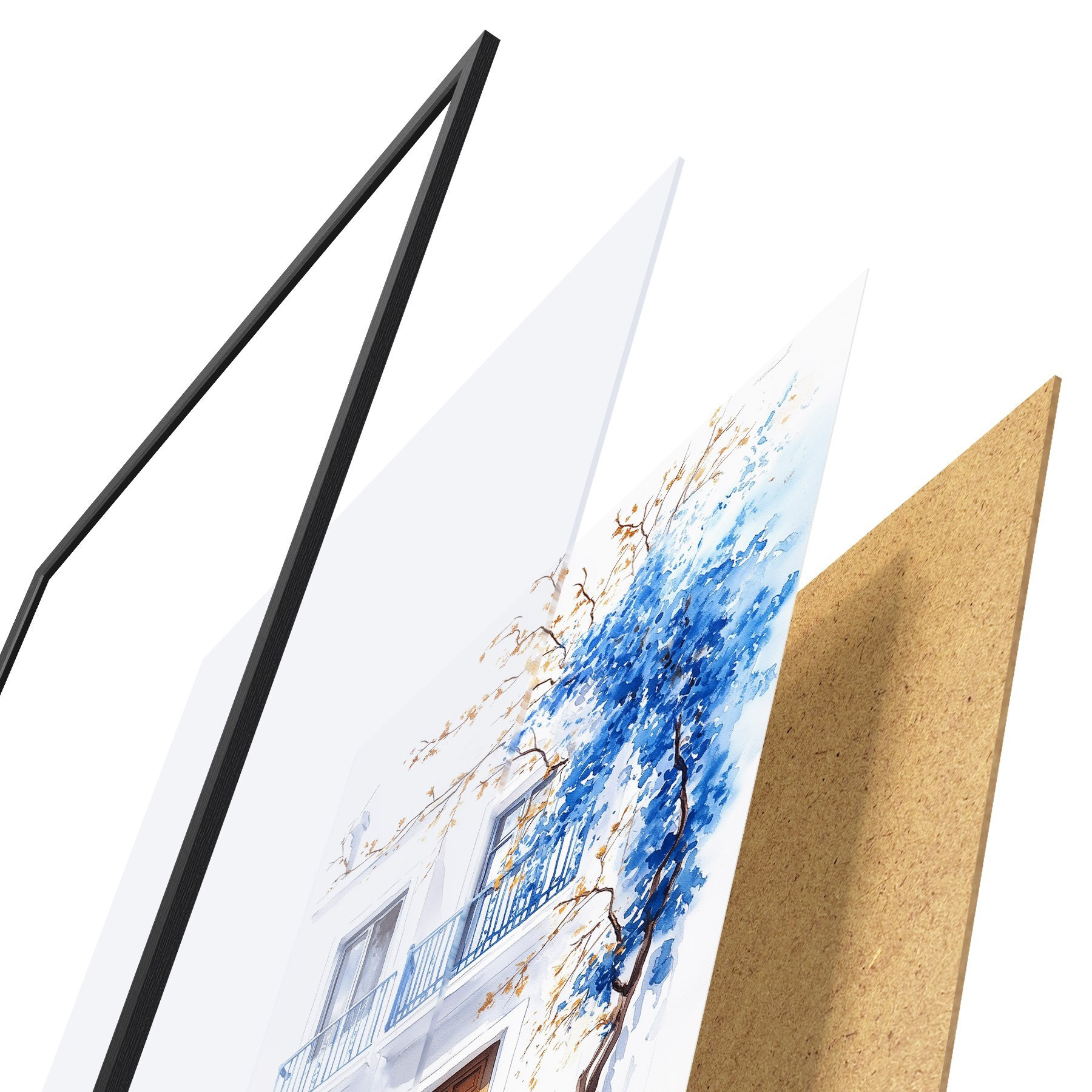 Plakatas Žydintis medis su mėlynomis gėlėmis, baltas namas, Graikija, akvarelės stilius f43183