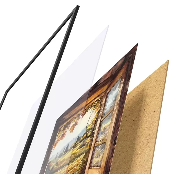 Plakatą sudaro rėmas, pleksiklas, atspausdintas vaizdas ir medžio drožlių plokštės pagrindas. Plakatą galima iš karto pakabinti ant sienos dėl kitoje pusėje esančių laikiklių.