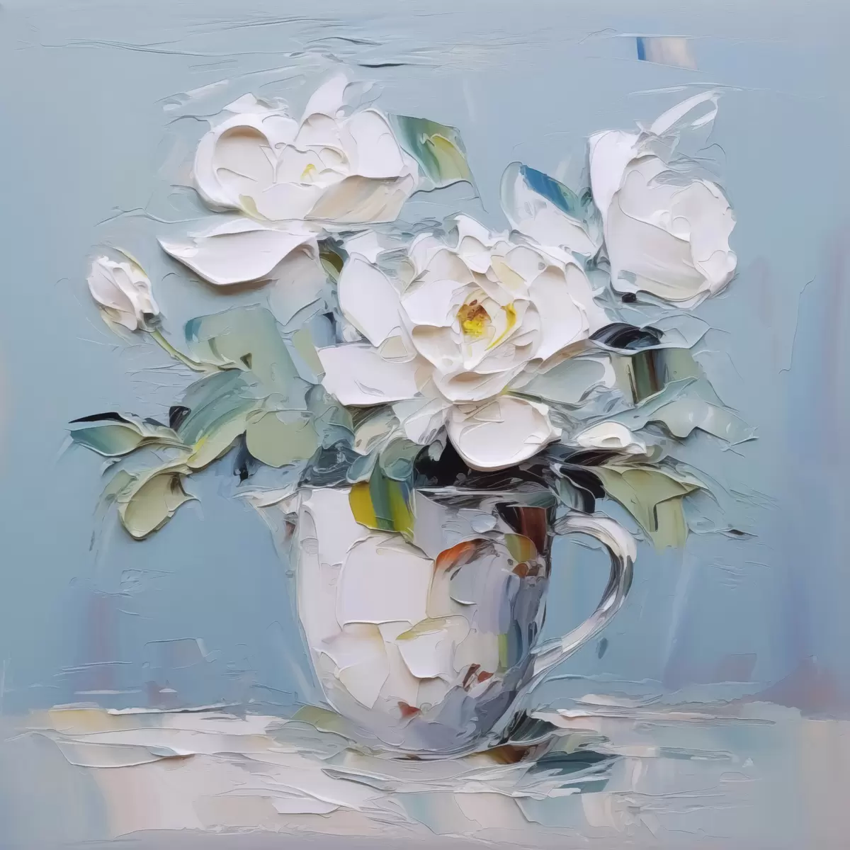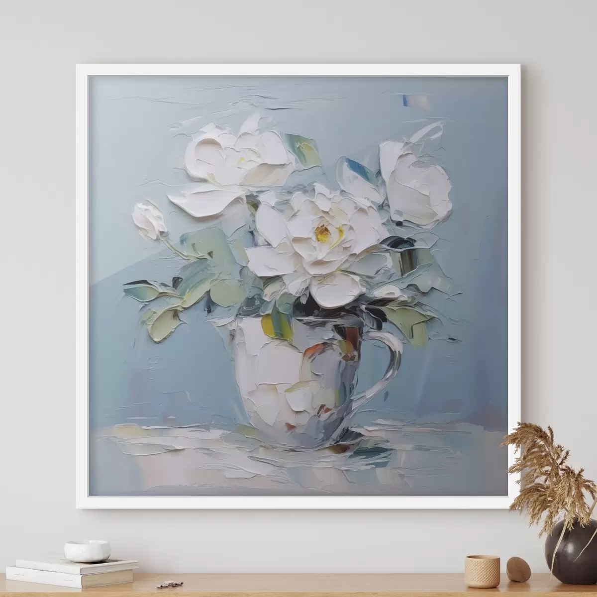 Plakatas Baltos gėlės puodelyje imituojanti tapyba f43225