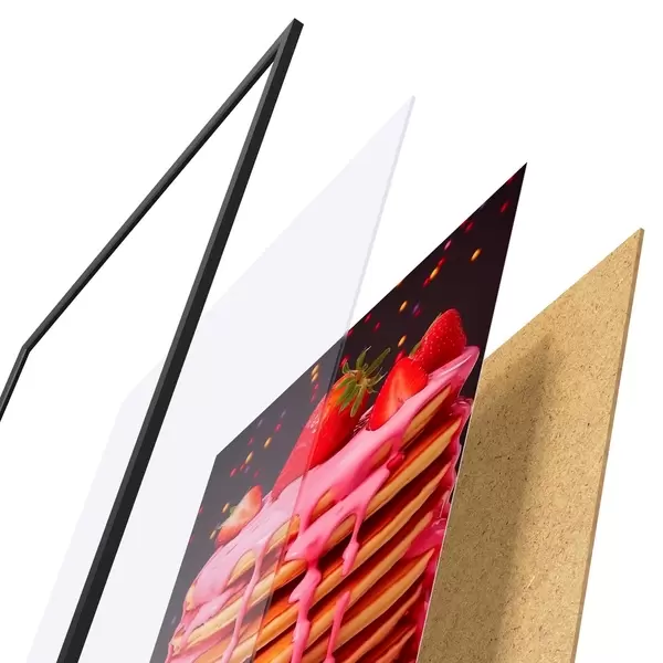 Plakatą sudaro rėmas, pleksiklas, atspausdintas vaizdas ir medžio drožlių plokštės pagrindas. Plakatą galima iš karto pakabinti ant sienos dėl kitoje pusėje esančių laikiklių.