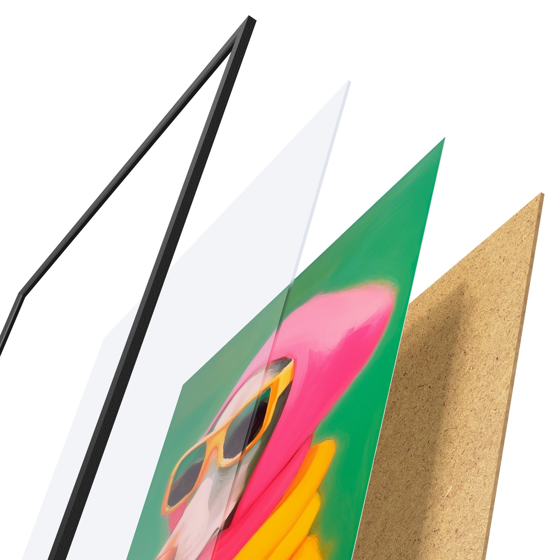 Plakatą sudaro rėmas, pleksiklas, atspausdintas vaizdas ir medžio drožlių plokštės pagrindas. Plakatą galima iš karto pakabinti ant sienos dėl kitoje pusėje esančių laikiklių.
