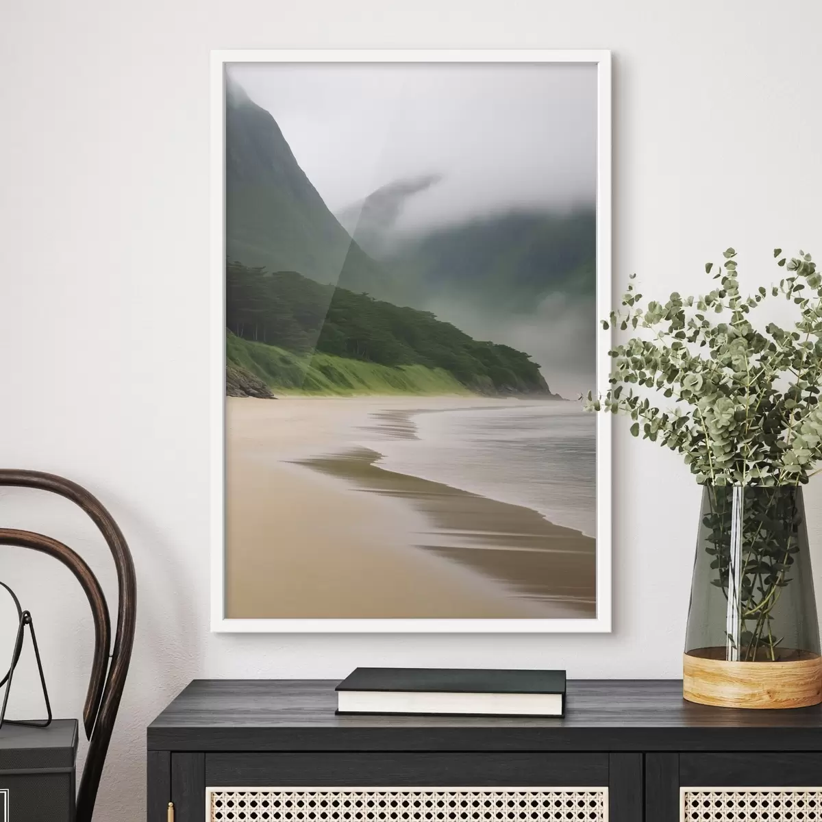 Plakatas Miglotas paplūdimys šalia žalių šlaitų f43271