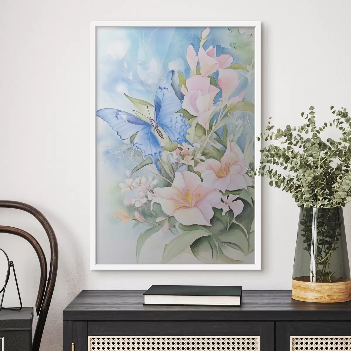 Plakatas Mėlynas drugelis ir rožinės gėlės f43296