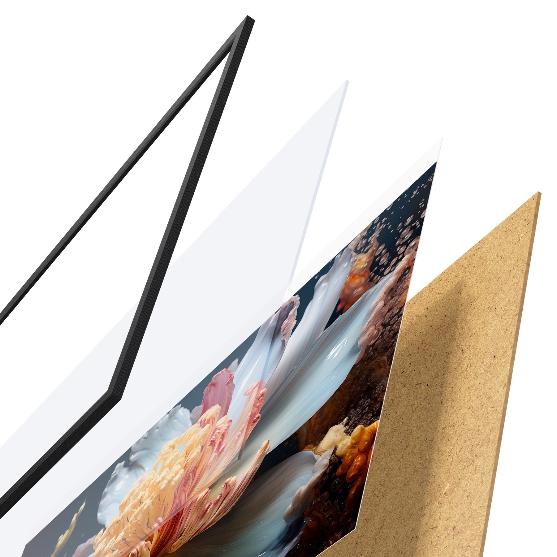 Plakatą sudaro rėmas, pleksiklas, atspausdintas vaizdas ir medžio drožlių plokštės pagrindas. Plakatą galima iš karto pakabinti ant sienos dėl kitoje pusėje esančių laikiklių.