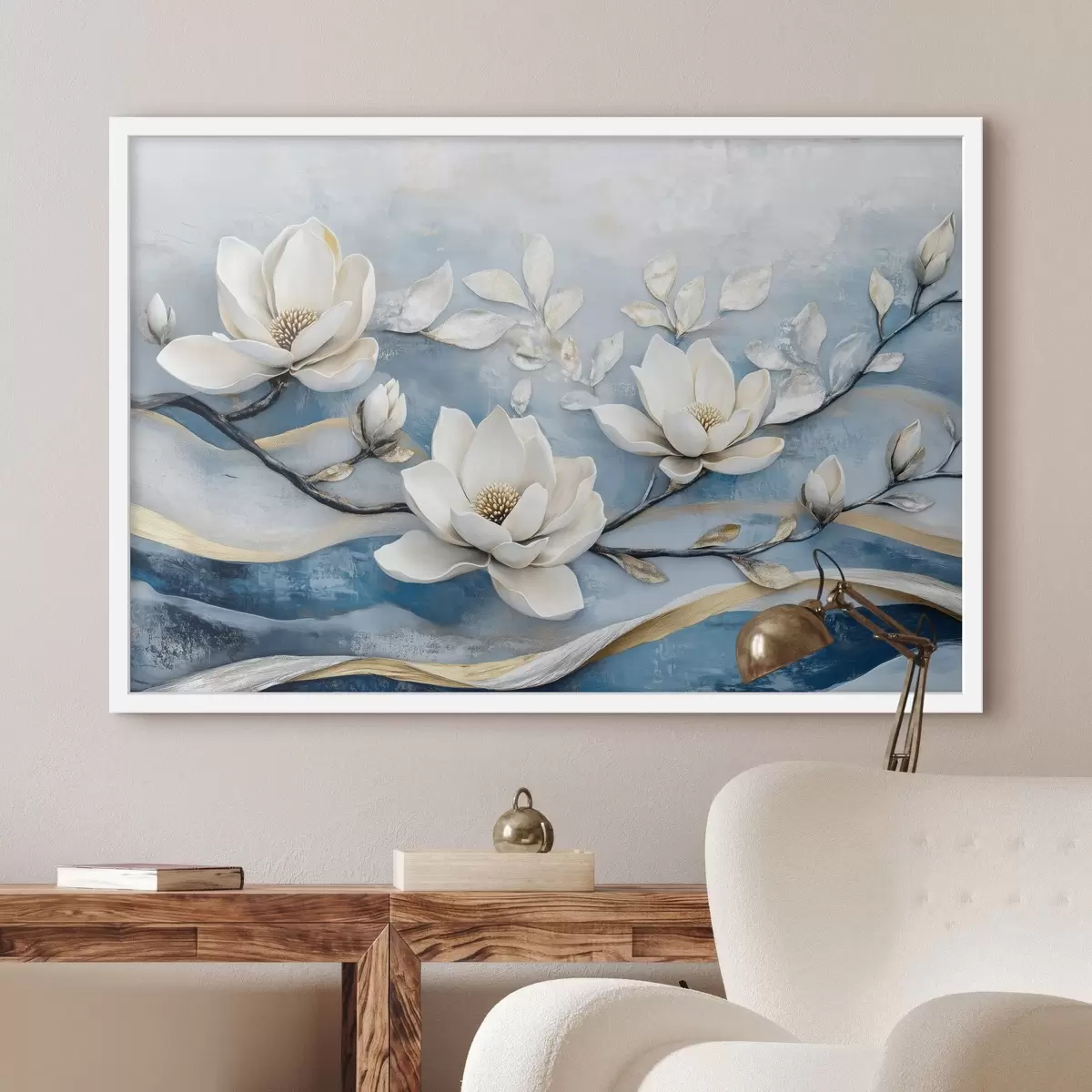 Plakatas Magnolijos šaka abstrakčiame mėlynai geltoname fone f43323