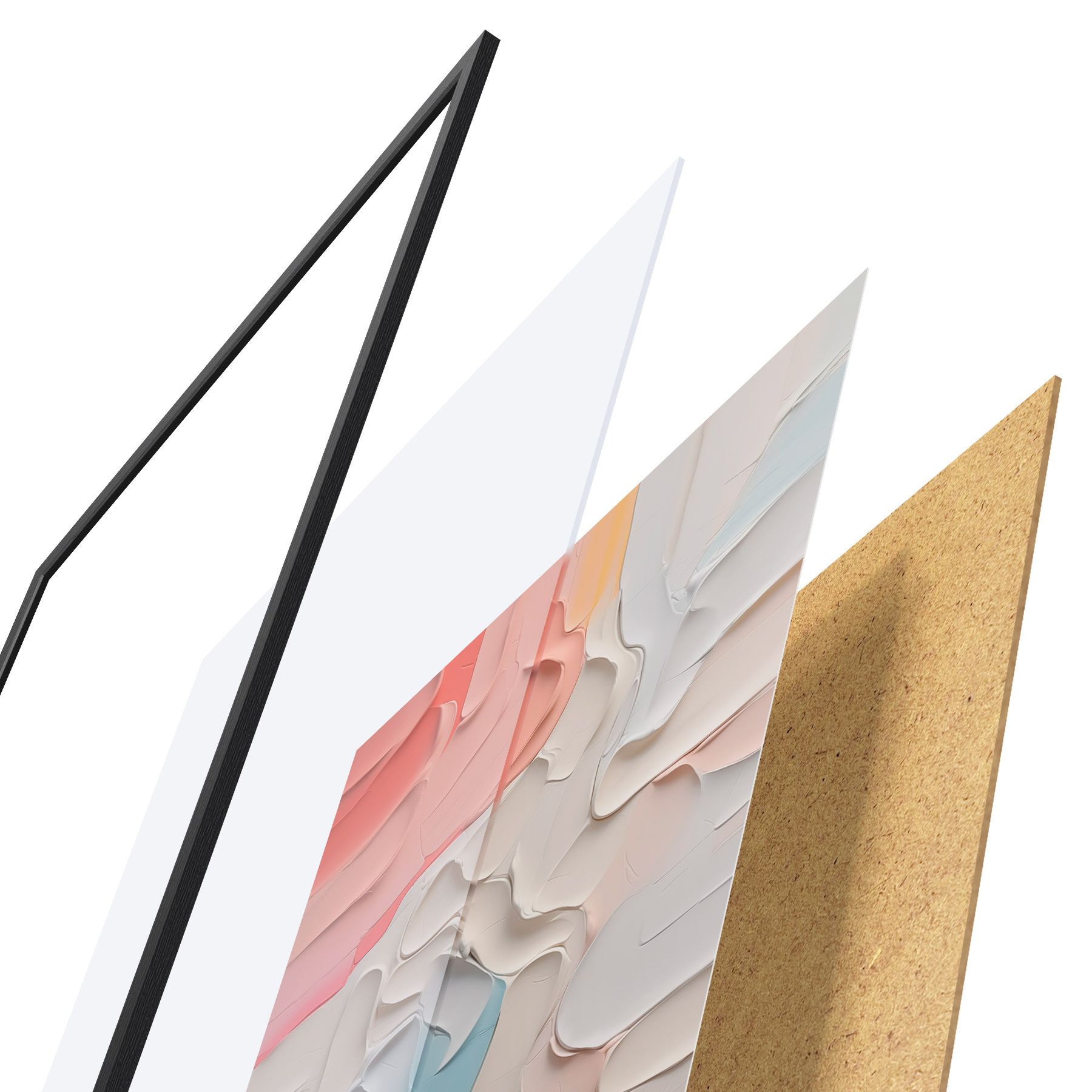 Plakatą sudaro rėmas, pleksiklas, atspausdintas vaizdas ir medžio drožlių plokštės pagrindas. Plakatą galima iš karto pakabinti ant sienos dėl kitoje pusėje esančių laikiklių.