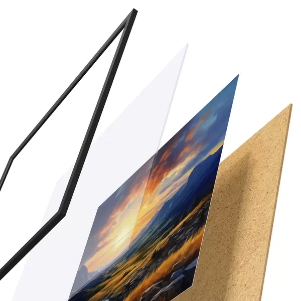 Plakatą sudaro rėmas, pleksiklas, atspausdintas vaizdas ir medžio drožlių plokštės pagrindas. Plakatą galima iš karto pakabinti ant sienos dėl kitoje pusėje esančių laikiklių.