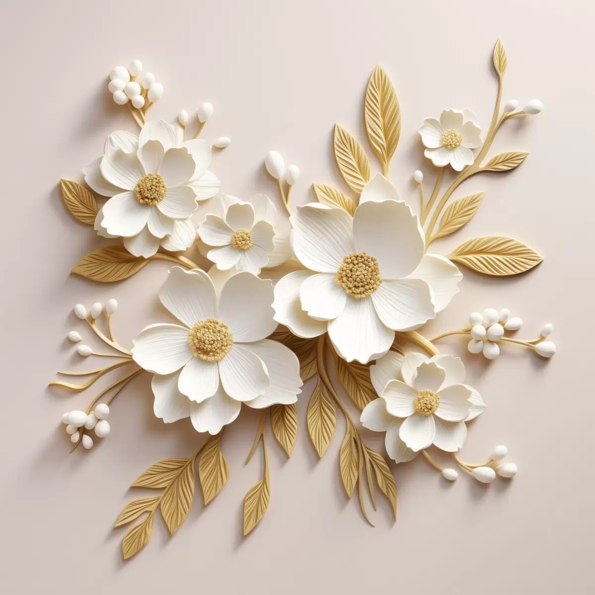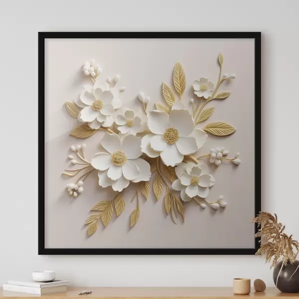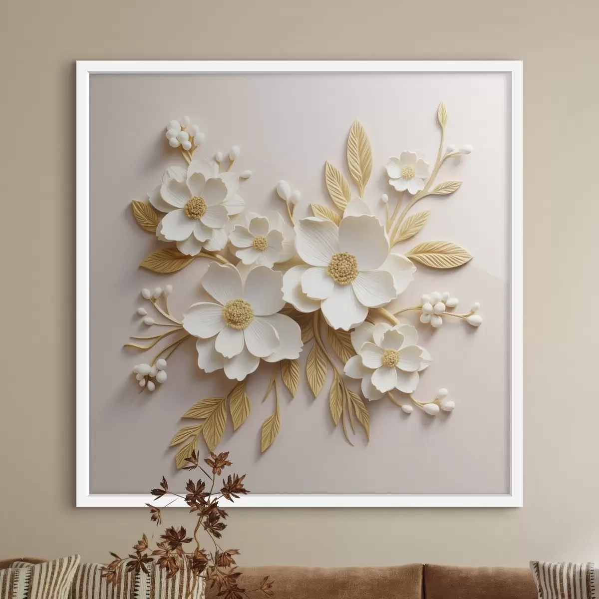 Plakatas 3D baltos gėlės su lapais kreminiame fone Ne f43383