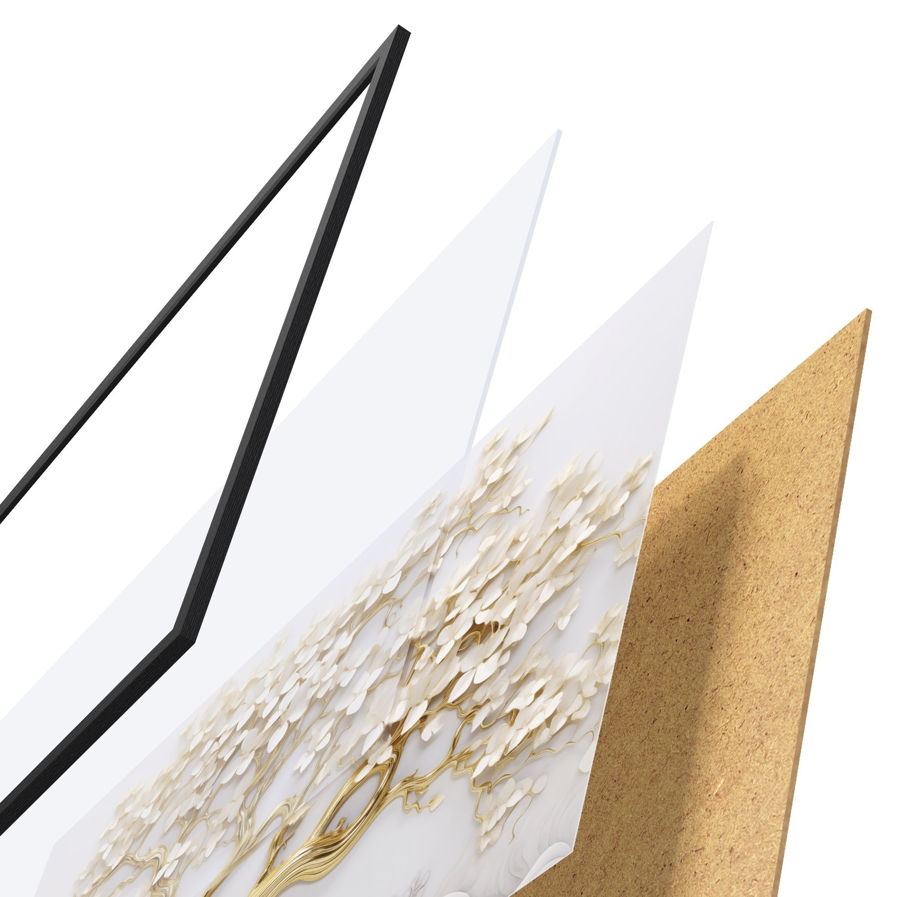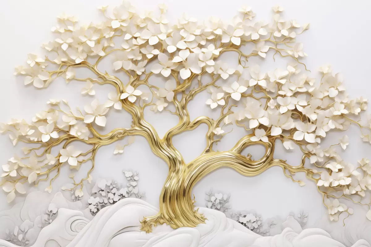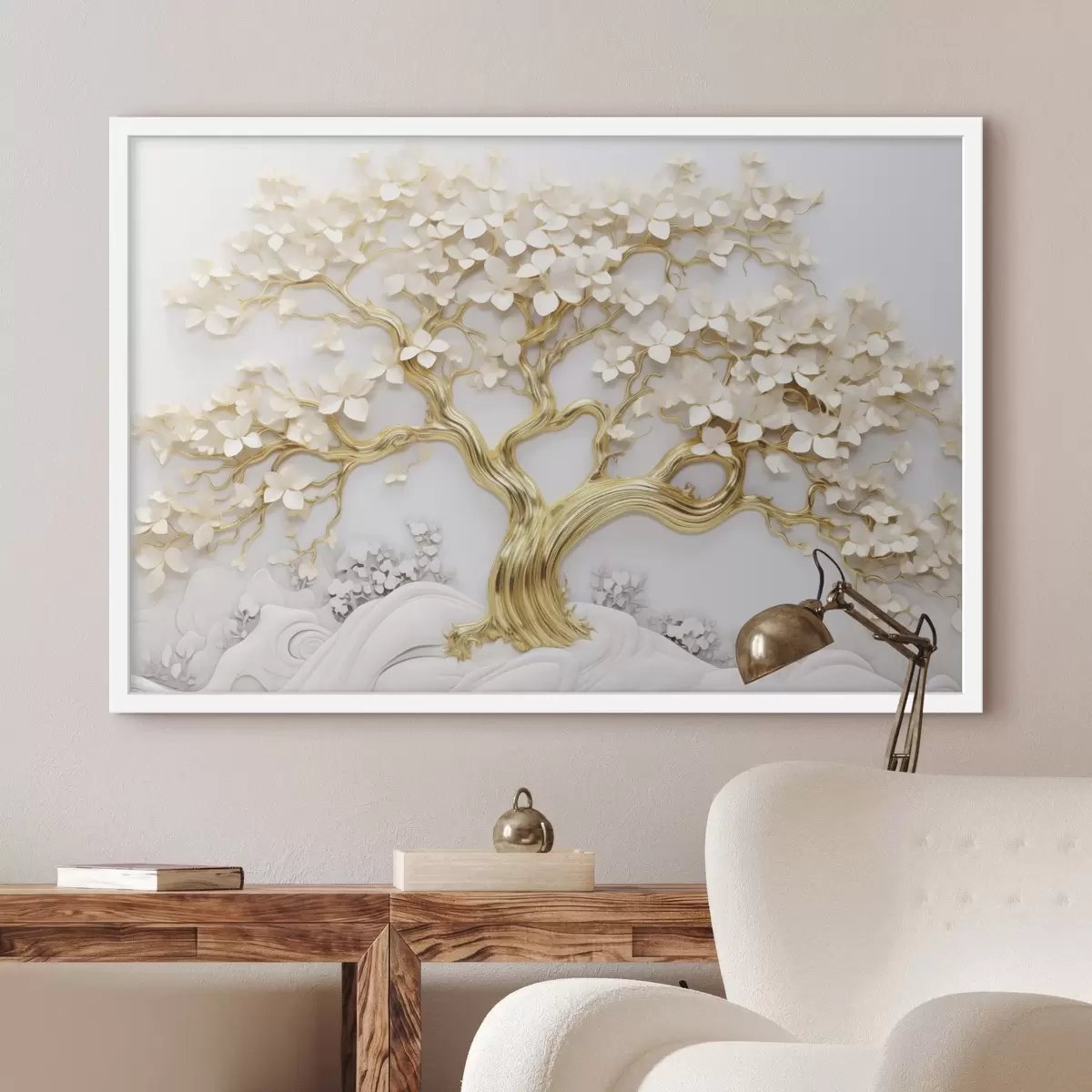 Plakatas Dekoratyvinis medis su baltomis gėlėmis, baltas fonas, baltos uolos, sudėtingos detalės, gamtos įkvėptas menas f43388