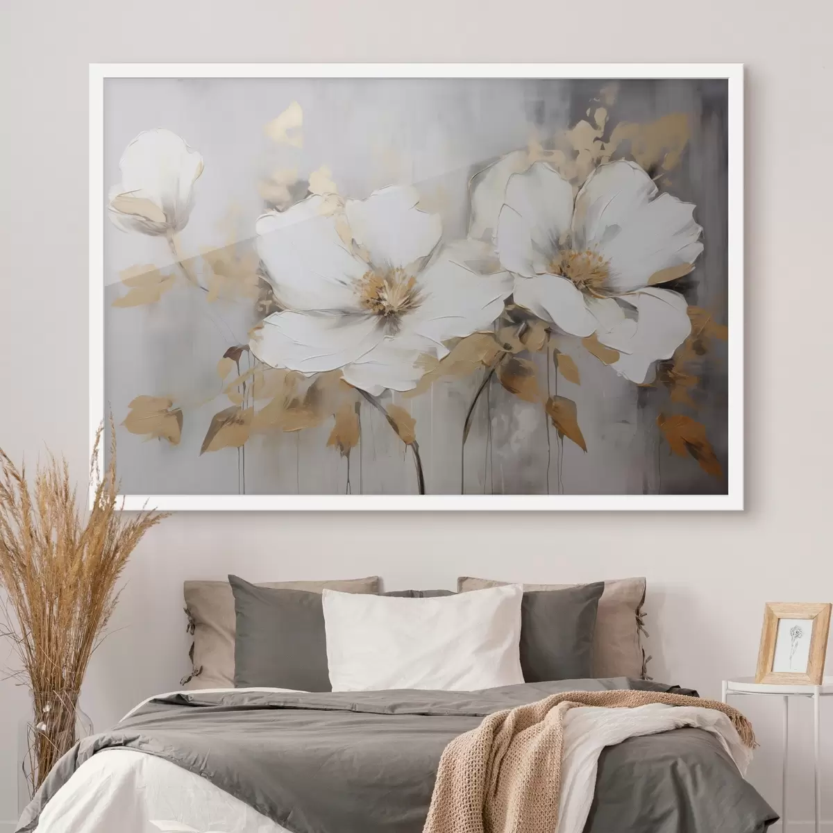 Plakatas Baltos gėlės su geltonais lapais baltame fone, storų potėpių imitacija, tekstūruotas modernus stilius f43389