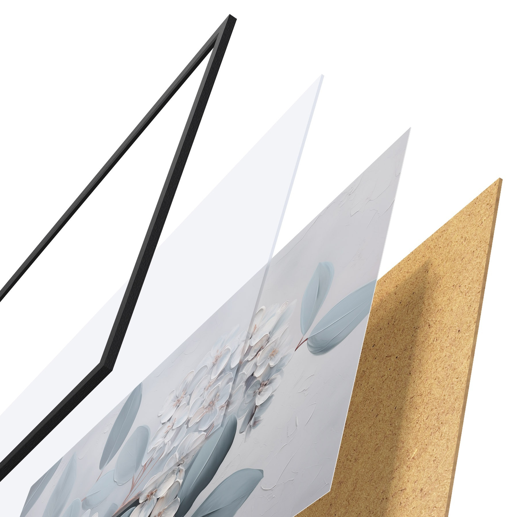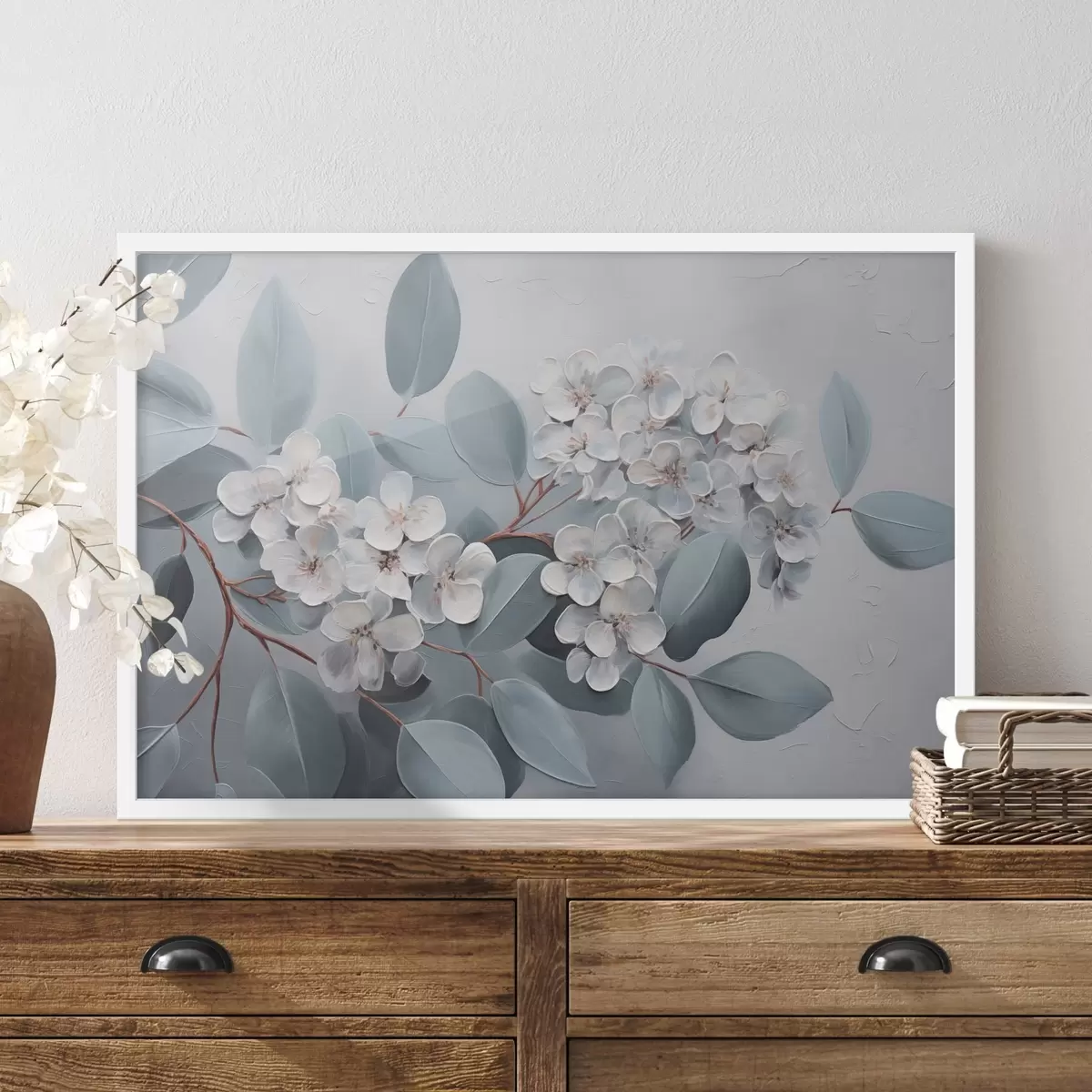 Plakatas Baltų hortenzijų žiedų šaka žydi, su mėlynais lapais šviesiai pilkame fone, aliejinės tapybos stilius Ne f43391
