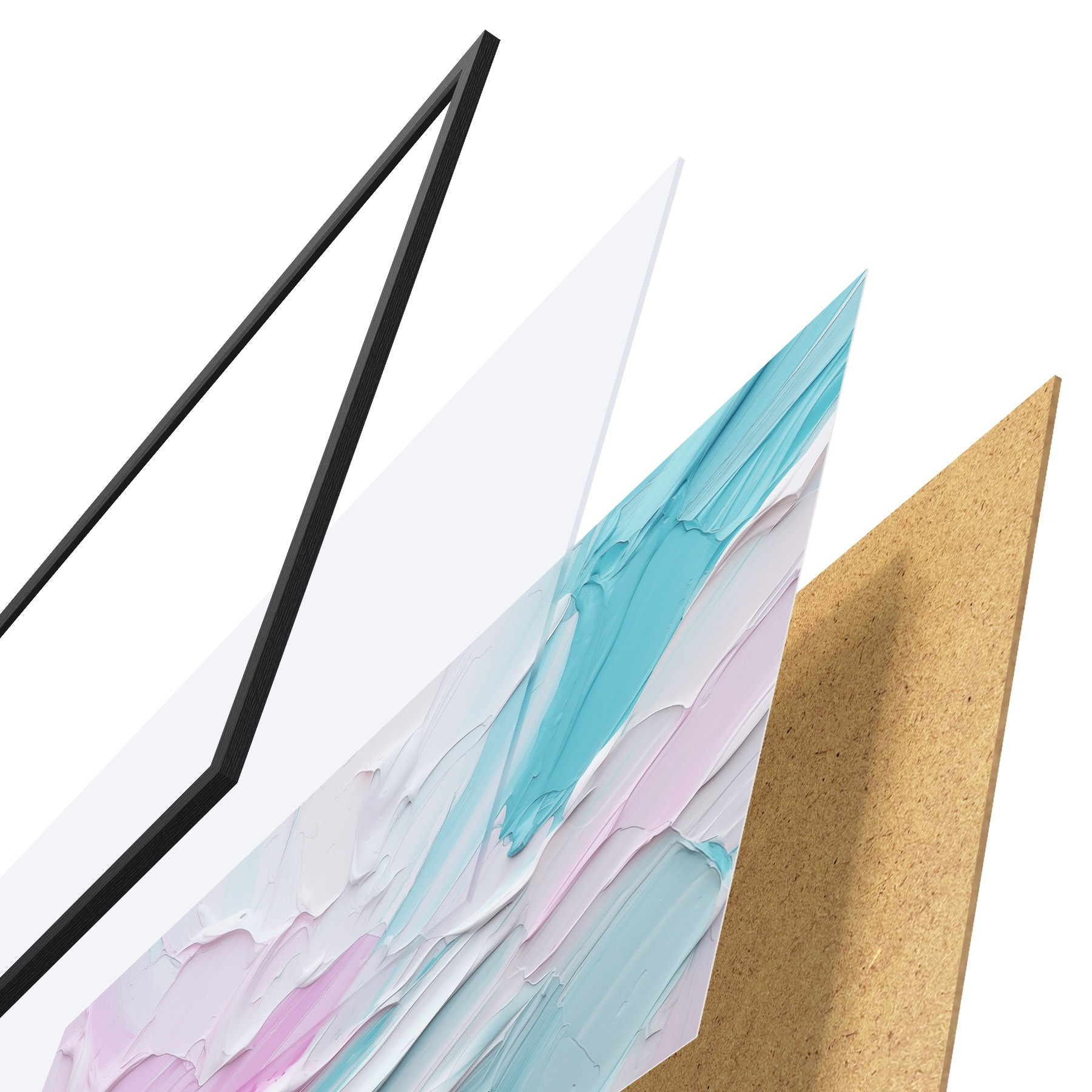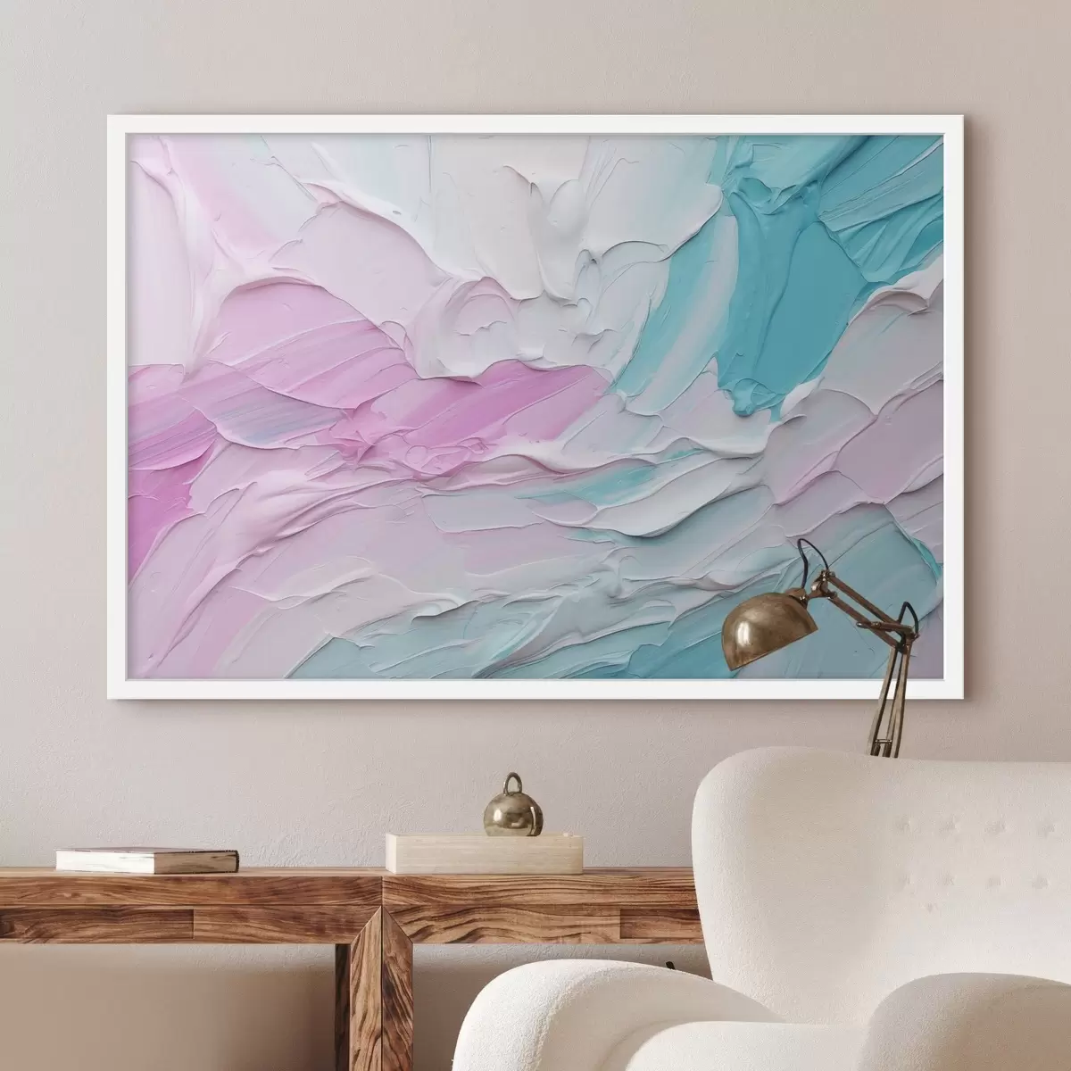 Plakatas Abstrakti aliejinės tapybos imitacija su storais rausvų, baltų ir turkio spalvos dažų potėpiais, sukuriančiais tekstūros efektą f43393