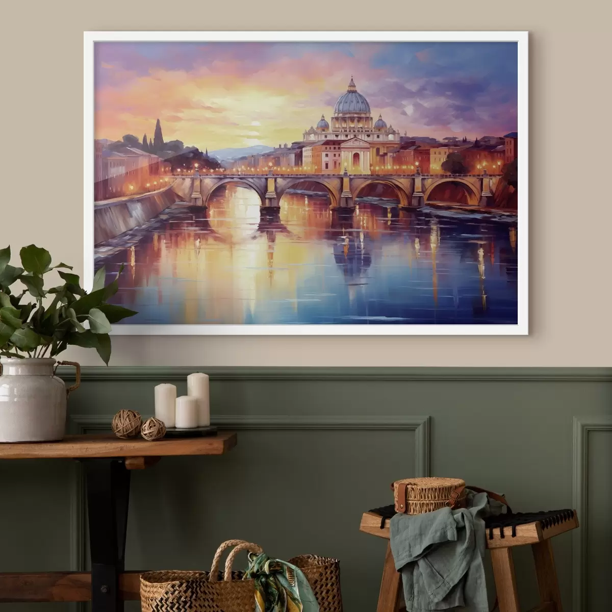Plakatas Šventojo Petro bazilika ir tiltas per upę saulėlydžio metu, šiltos spalvos, atspindys vandenyje, aliejinės tapybos stilius f43396