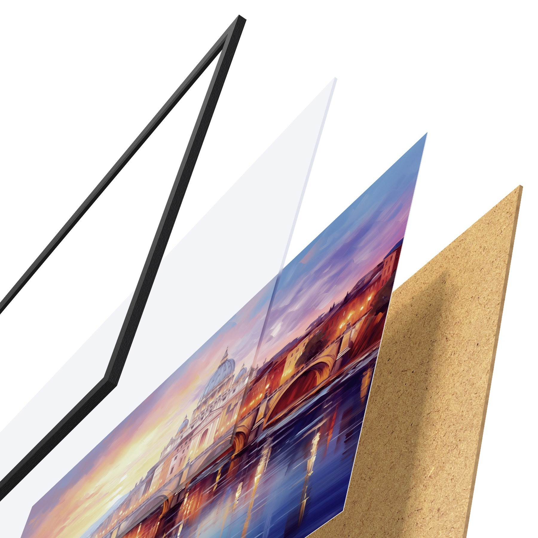 Plakatą sudaro rėmas, pleksiklas, atspausdintas vaizdas ir medžio drožlių plokštės pagrindas. Plakatą galima iš karto pakabinti ant sienos dėl kitoje pusėje esančių laikiklių.