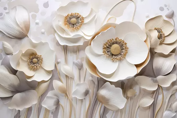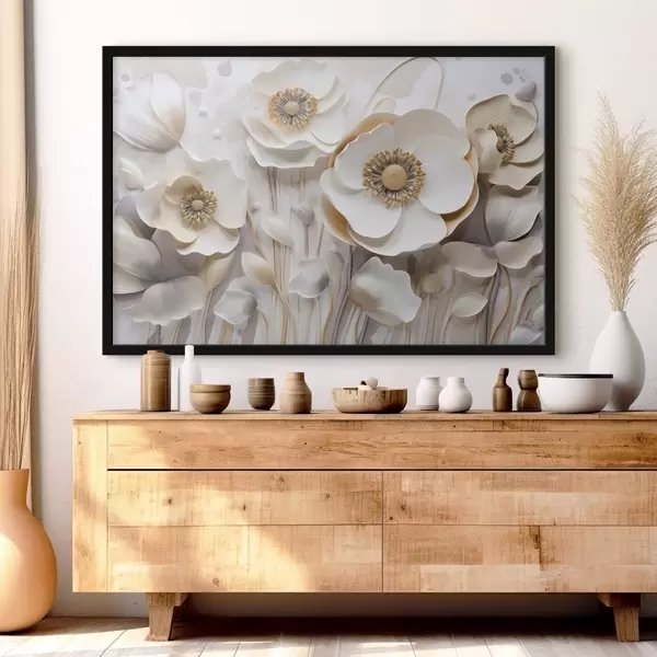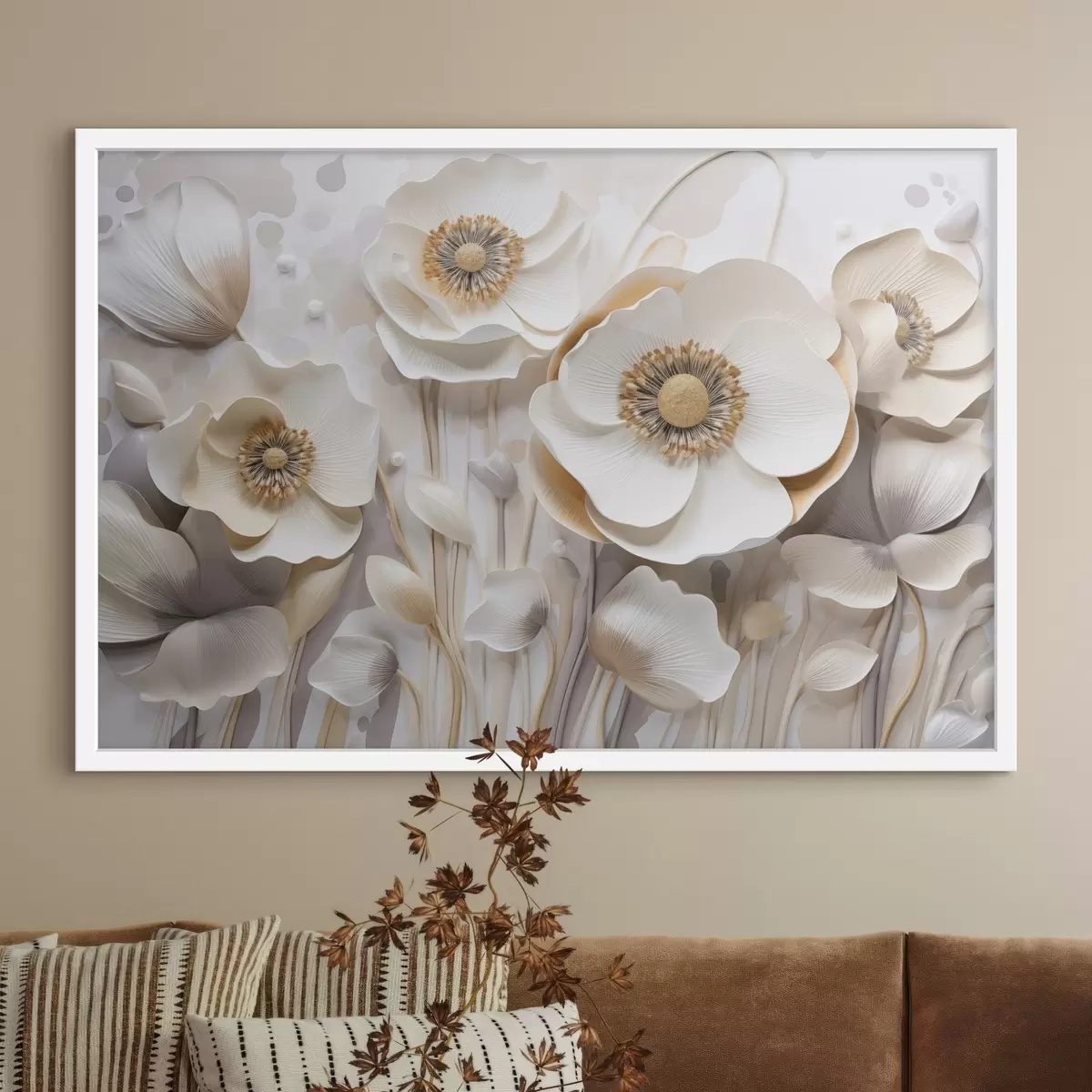 Plakatas Baltos anemonų gėlės su geltonais centrais, minimalistinis fonas, sukuriantis subtilų gėlių dizainą f43400