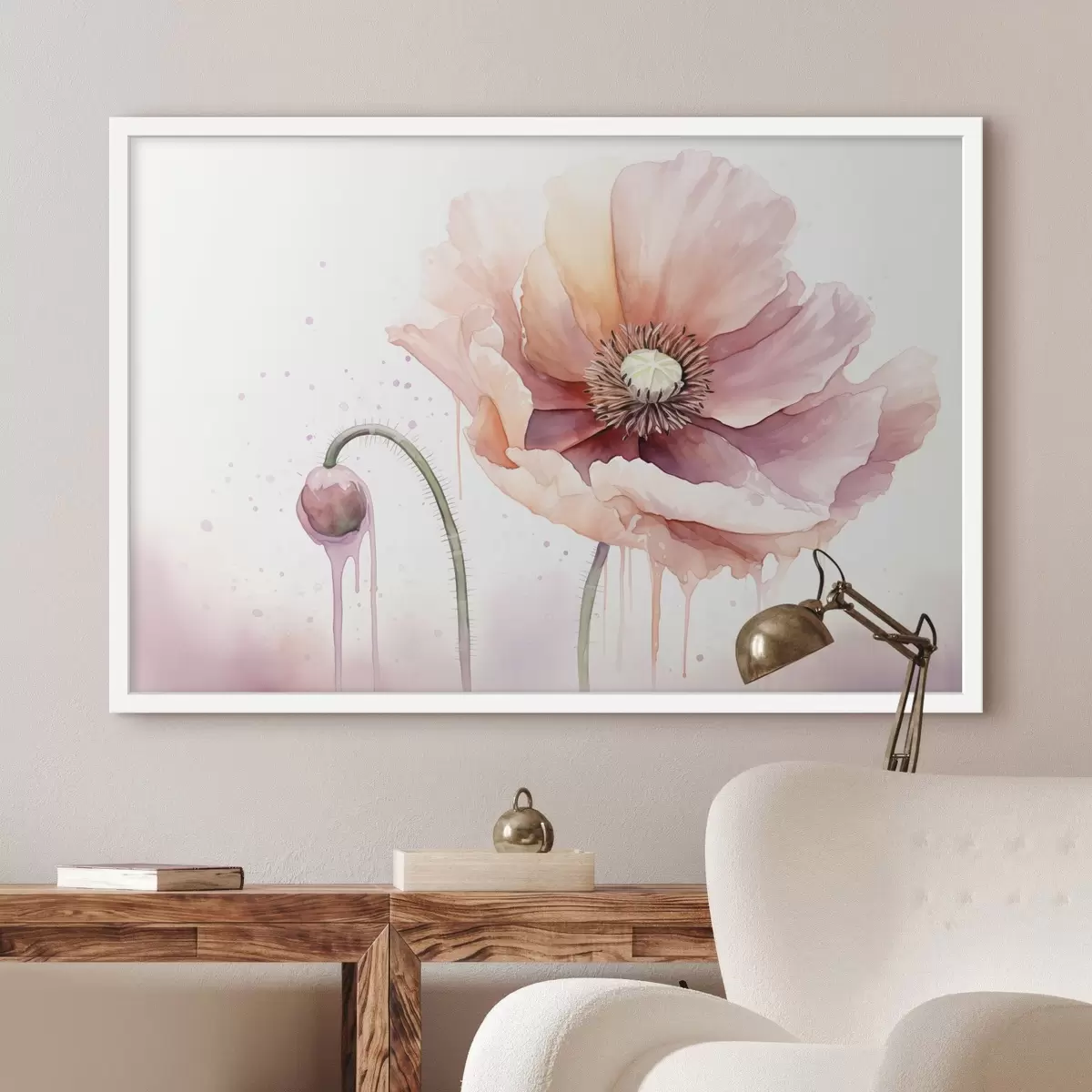 Plakatas Rožinė aguona su pumpuru baltame fone, akvarelės tapybos imitacija su lašelinėmis, švelnios spalvos f43402