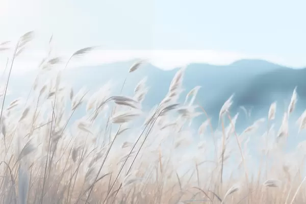 Plakatas Žolė, pampų laukas su mėlynu kalnu fone, šviesiai mėlynas dangus, minimalistinis, pastelinės spalvos Ne f43404