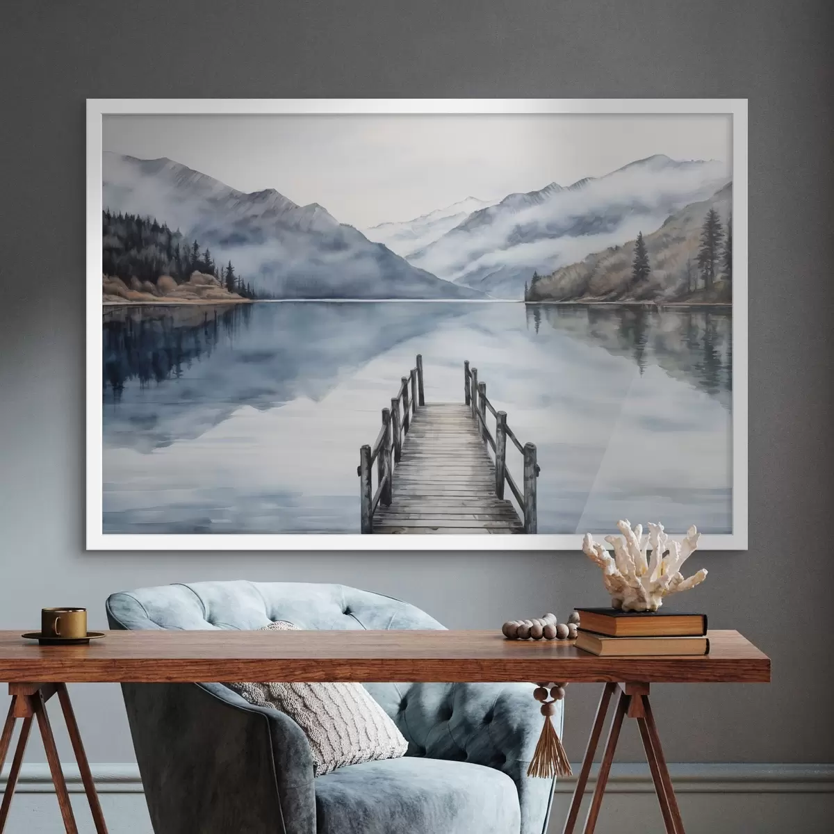 Plakatas Akvarelės stiliumi akvarelė - medinis dokas, besidriekiantis į ramų ežerą, apsuptą kalnų ir visžalių medžių Ne f43405
