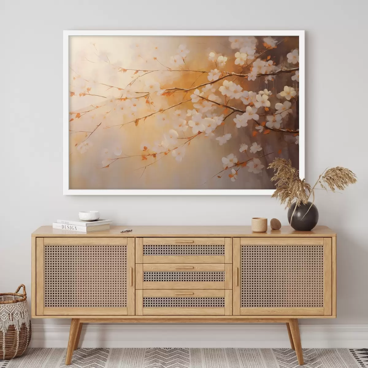 Plakatas Vyšnių žiedų šakos su oranžiniais žiedais, šiltų spalvų paletė, neryškiame geltonų atspalvių fone f43407