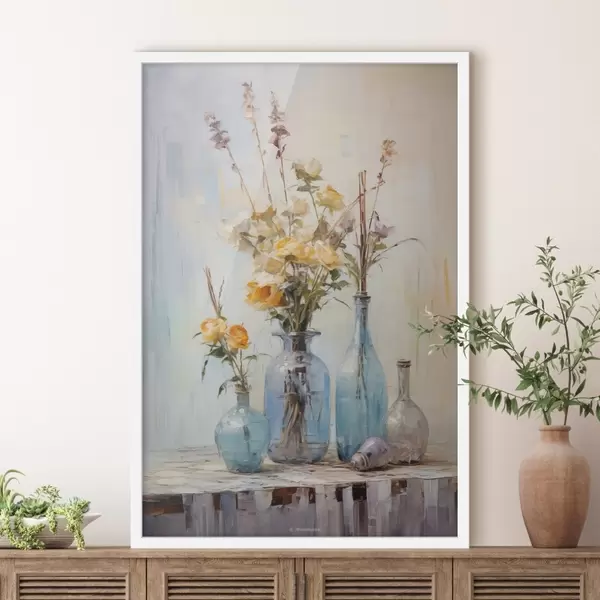 Plakatas Geltonų rožių natiurmortas mėlynose stiklinėse vazose, lengvos tekstūros fonas, švelnūs teptuko potėpiai, aliejinės tapybos stilius Ne f43409
