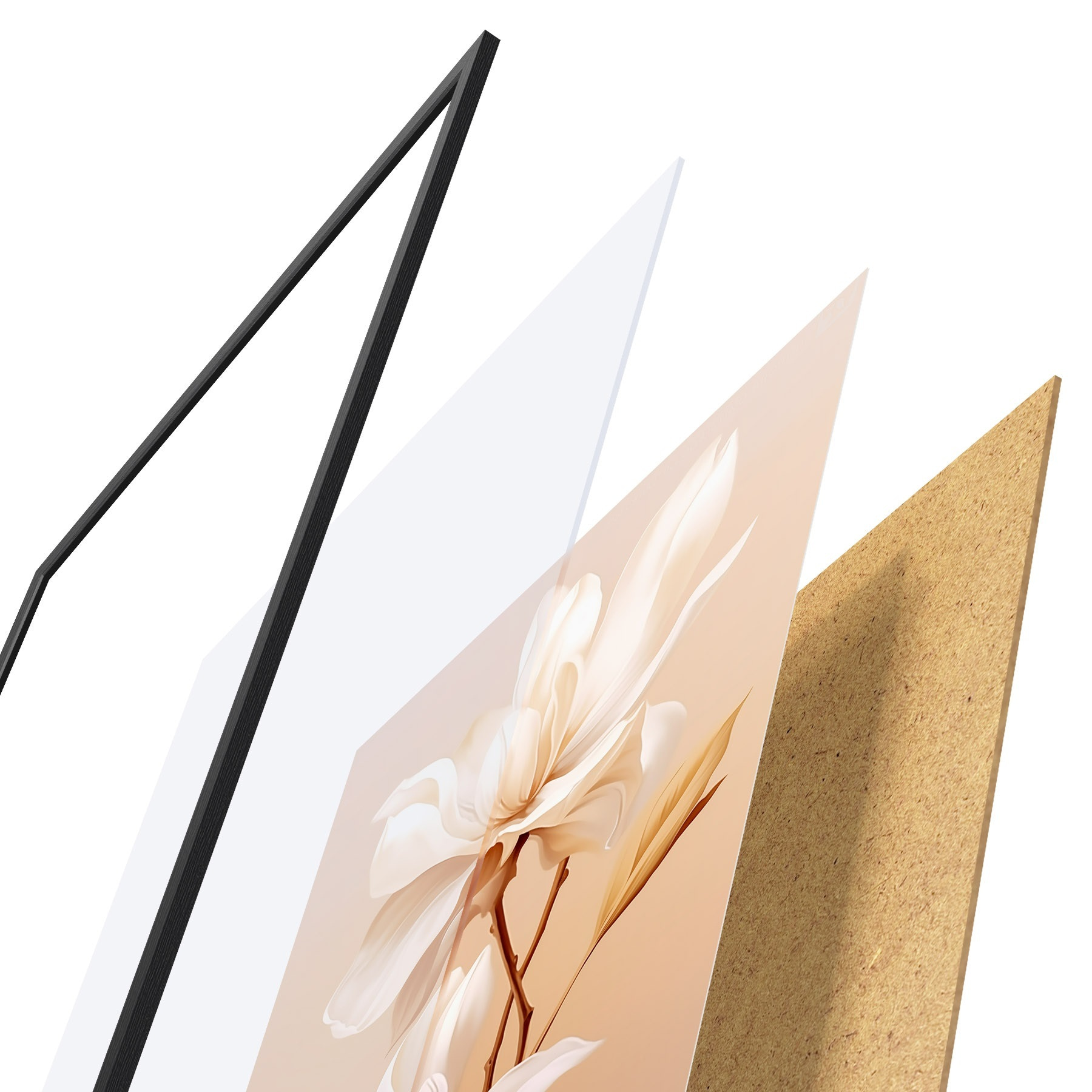 Plakatą sudaro rėmas, pleksiklas, atspausdintas vaizdas ir medžio drožlių plokštės pagrindas. Plakatą galima iš karto pakabinti ant sienos dėl kitoje pusėje esančių laikiklių.