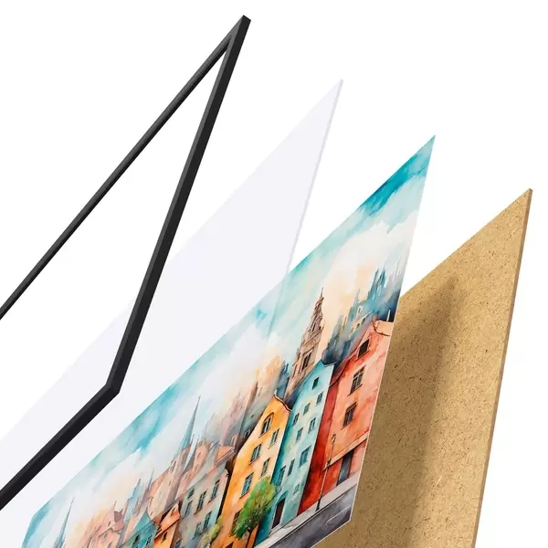 Plakatą sudaro rėmas, pleksiklas, atspausdintas vaizdas ir medžio drožlių plokštės pagrindas. Plakatą galima iš karto pakabinti ant sienos dėl kitoje pusėje esančių laikiklių.