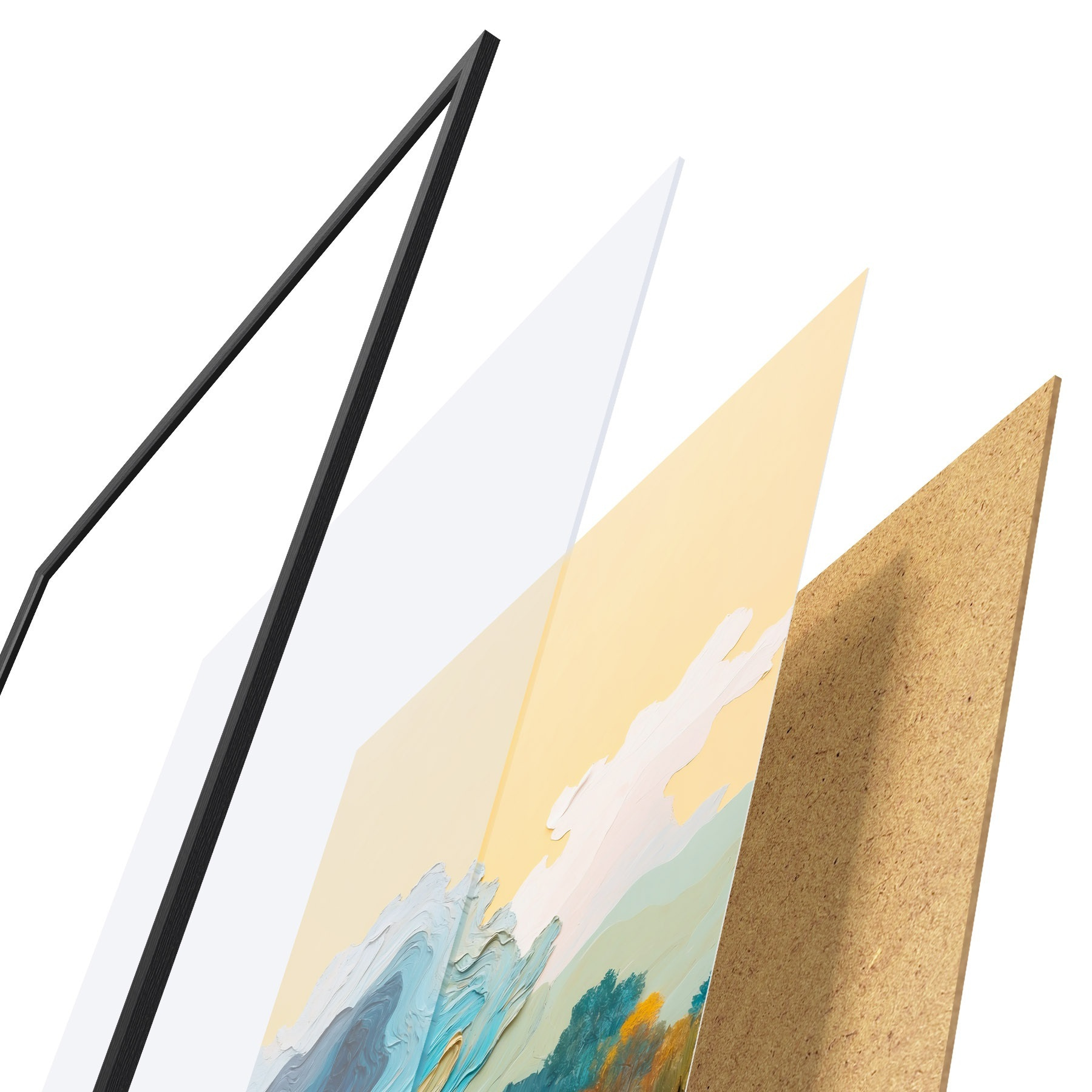 Plakatą sudaro rėmas, pleksiklas, atspausdintas vaizdas ir medžio drožlių plokštės pagrindas. Plakatą galima iš karto pakabinti ant sienos dėl kitoje pusėje esančių laikiklių.