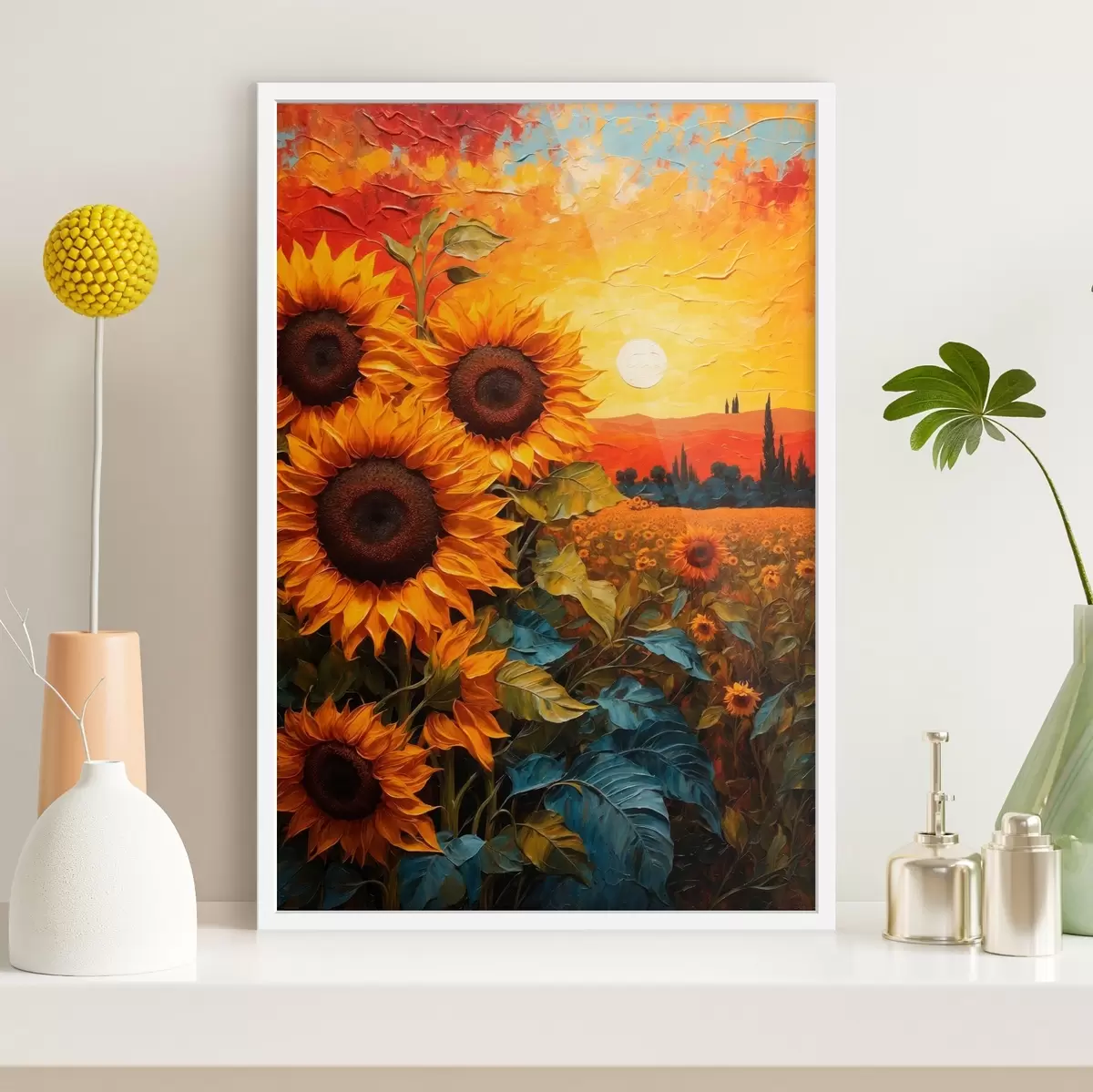 Plakatas Saulėgrąžų laukas saulėlydžio metu f43460