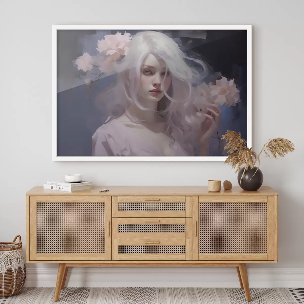 Plakatas Mergaitė su bijūnais, akrilo stiliaus piešinys, tamsus fonas Ne f43496