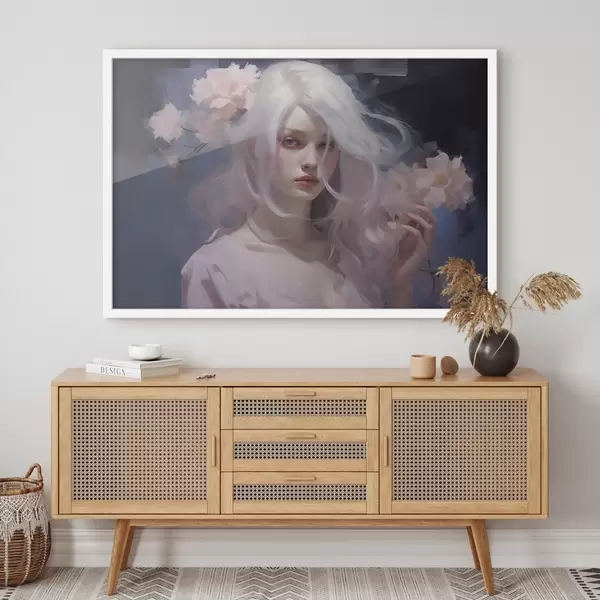 Plakatas Mergaitė su bijūnais, akrilo stiliaus piešinys, tamsus fonas f43496