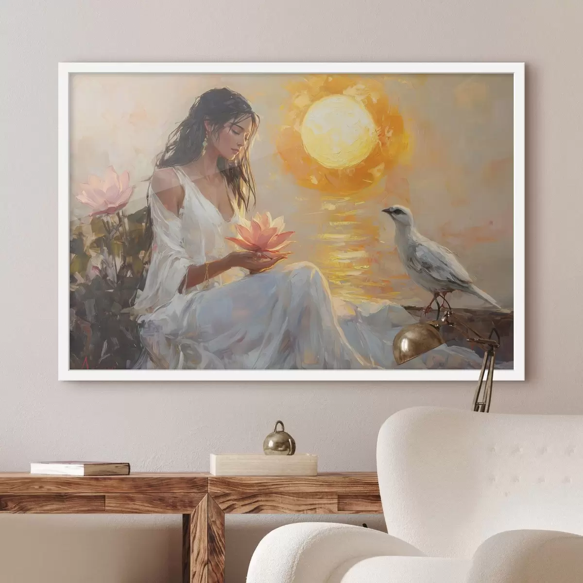 Plakatas Moteris su lotoso žiedu saulėlydyje, baltas paukštis, piešinys aliejiniais dažais Ne f43501
