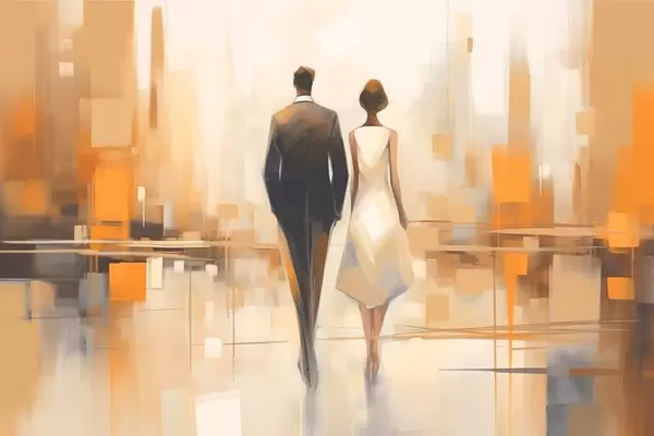 Plakatas Abstrakcija su miesto siluetais ir dviem figūromis Ne f43516