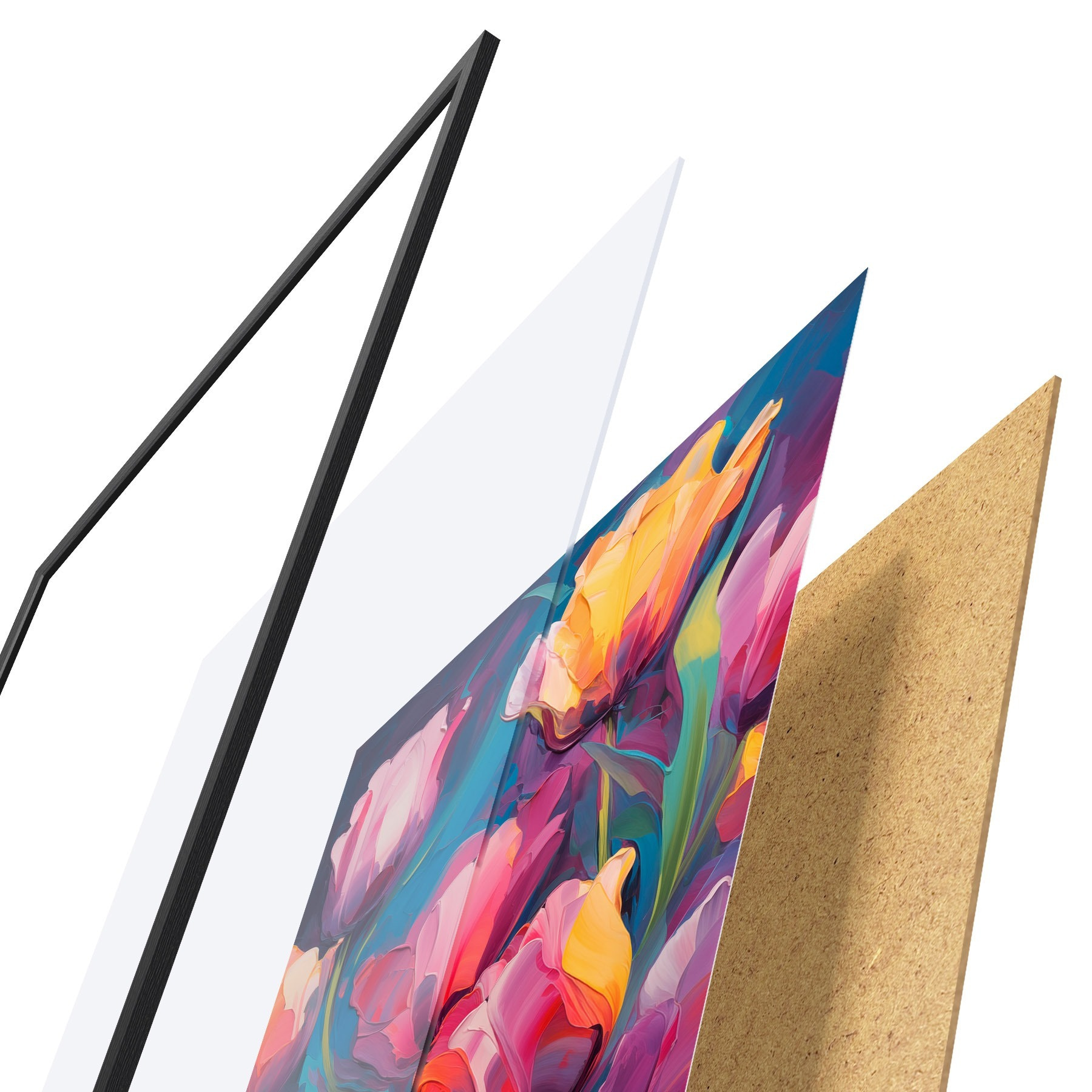Plakatą sudaro rėmas, pleksiklas, atspausdintas vaizdas ir medžio drožlių plokštės pagrindas. Plakatą galima iš karto pakabinti ant sienos dėl kitoje pusėje esančių laikiklių.