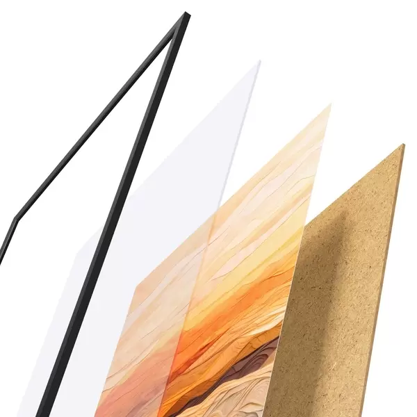 Plakatą sudaro rėmas, pleksiklas, atspausdintas vaizdas ir medžio drožlių plokštės pagrindas. Plakatą galima iš karto pakabinti ant sienos dėl kitoje pusėje esančių laikiklių.