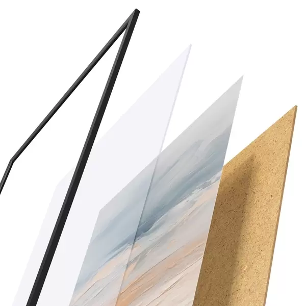 Plakatą sudaro rėmas, pleksiklas, atspausdintas vaizdas ir medžio drožlių plokštės pagrindas. Plakatą galima iš karto pakabinti ant sienos dėl kitoje pusėje esančių laikiklių.